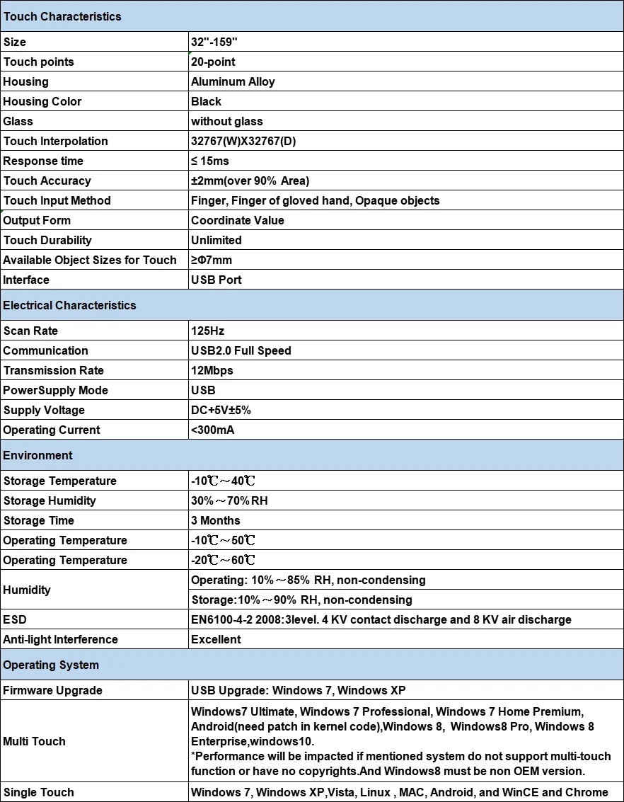 Specification for 48 inch 20 points IR multi touch screen::