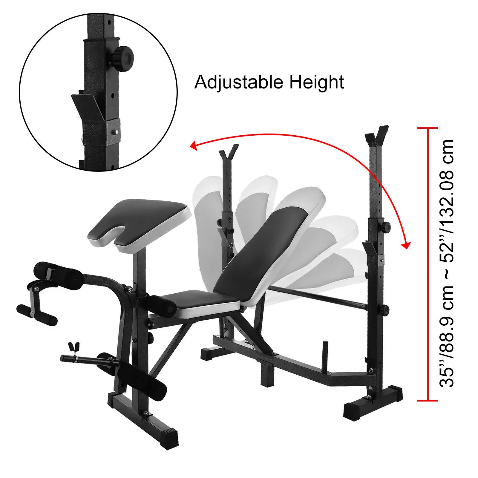 Взрослого скамья для тяжелой атлетики скамья имеет регулируемая высота 37 ''/93,98 см до 52"/132,08 см. Он имеет 5-позиционный Задняя накладка для наклона и восстановить плоское положение для вашего удобства.