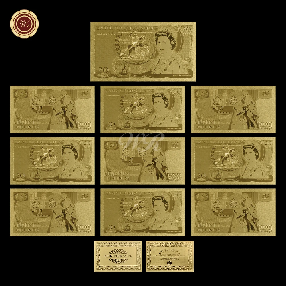 WR домашний декоративный 20 фунт Золотой банкноты 24k 999,9 Золотая фольга мировая бумага деньги художественное оформление для домашнего декора и коллекции