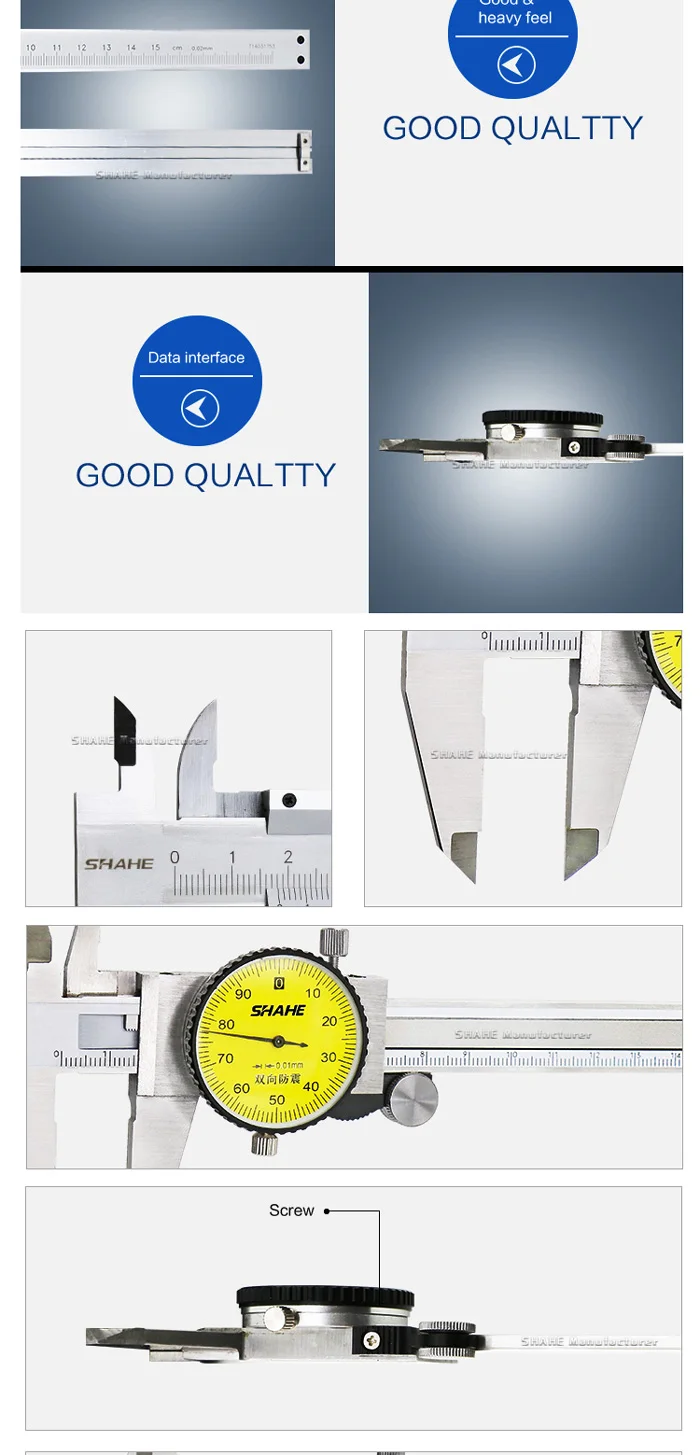 Четыре функции измерения внутреннего диаметра, внешнего диаметра, глубины и шага. Изготовлен из нержавеющей стали, не ржавеет производительность Двунаправленный индикатор землетрясения Металлический корпус имеет функцию предотвращения железа Поворотный циферблат ноль, затем замок