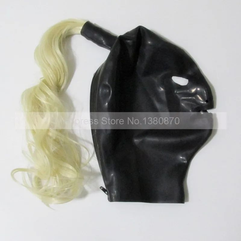 Сексуальный латексный капюшон, молния сзади, открытые глазаНоздри и рот, молния сзади, с pОнитейл
