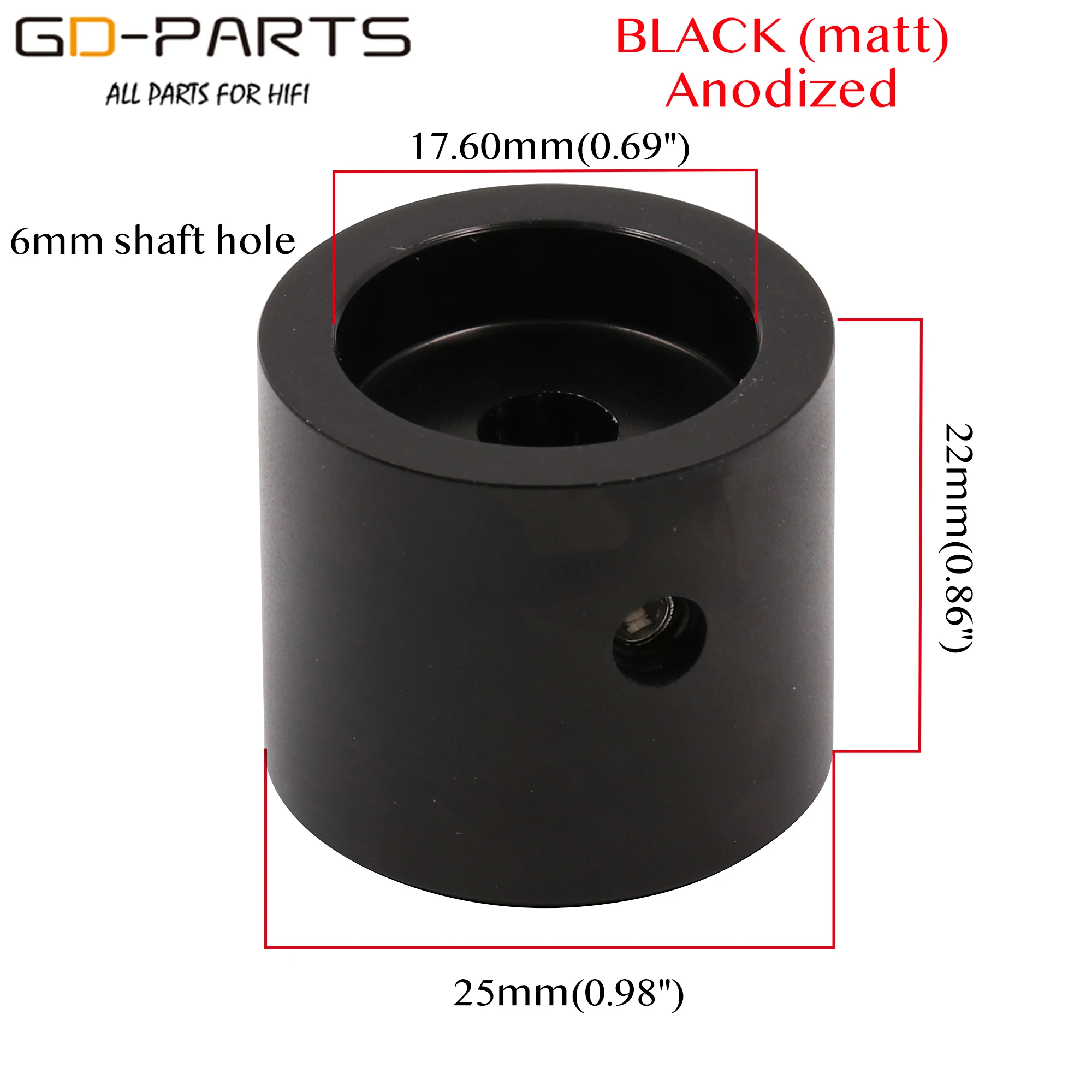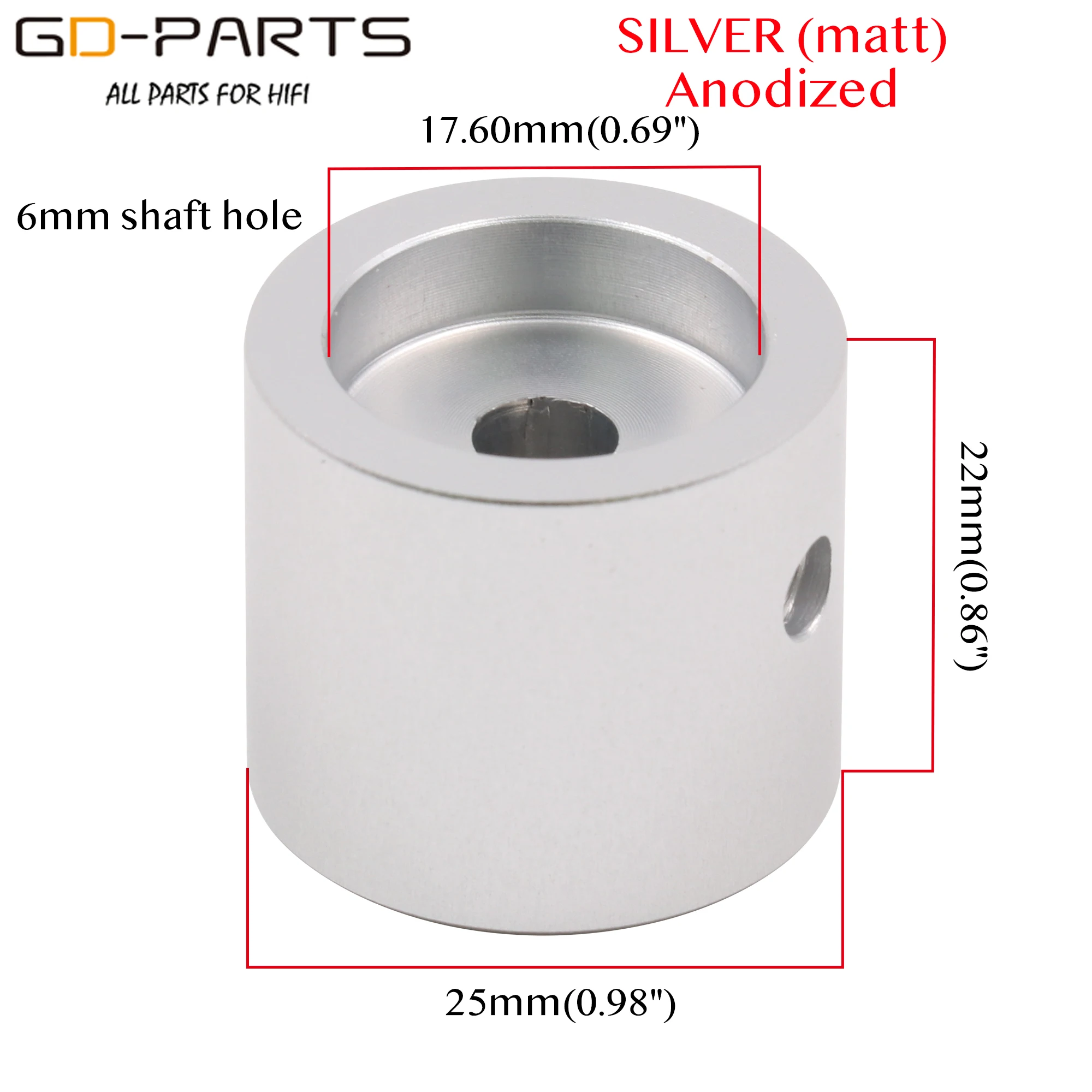 Материал: Твердый Алюминий, обработанный ЧПУ Цвет: серебристый, черный Поверхность: анодированная, пескоструйная обработка Диаметр: 25 мм • Высота: 22 мм Отверстие вала: 6 мм С установочный винт Количество: 1 шт./лот