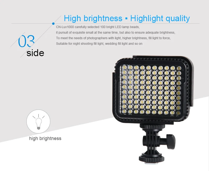 Adopt усовершенствованный цифровой дизайн вождения, с внутренним независимым диммером, для обеспечения стабильного тока светодиодов в различных диапазонах напряжения, продлевает срок службы светодиодов, низкое потребление эффективности преобразования цепи вождения достигает более 92%, экономит больше энергии и надежнее. Диммер принимает PWM диммер технологии, стать частью настоящего диммера. Больше корр при регулировании яркости. С правильным цветовым фильтром, magenta фильтром, чтобы удовлетворить ваш запрос высокой или низкой цветовой температуры. Встроенный дизайн, не требует каких-либо внешних аксессуаров, может быть построен вместе с той же моделью или той же серии света, более легкий и более гибкий при эксплуатации. Цветовая температура: 5600/3200 K Источник питания: Для Sony NP-F NP-FM серьезная батарея или Серия Panasonic NP-F или 6 батареек AA. Срок службы: 50000 часов Контроль яркости диммера. Освещение: 950лм Содержание: 1 * CN-LUX1000 Светодиодная лампа 3 * цветные фильтры 1 * адаптер батареи для Panasonic 1 * батарейный блок для батареи AA Примечание: аккумулятор не входит в комплект