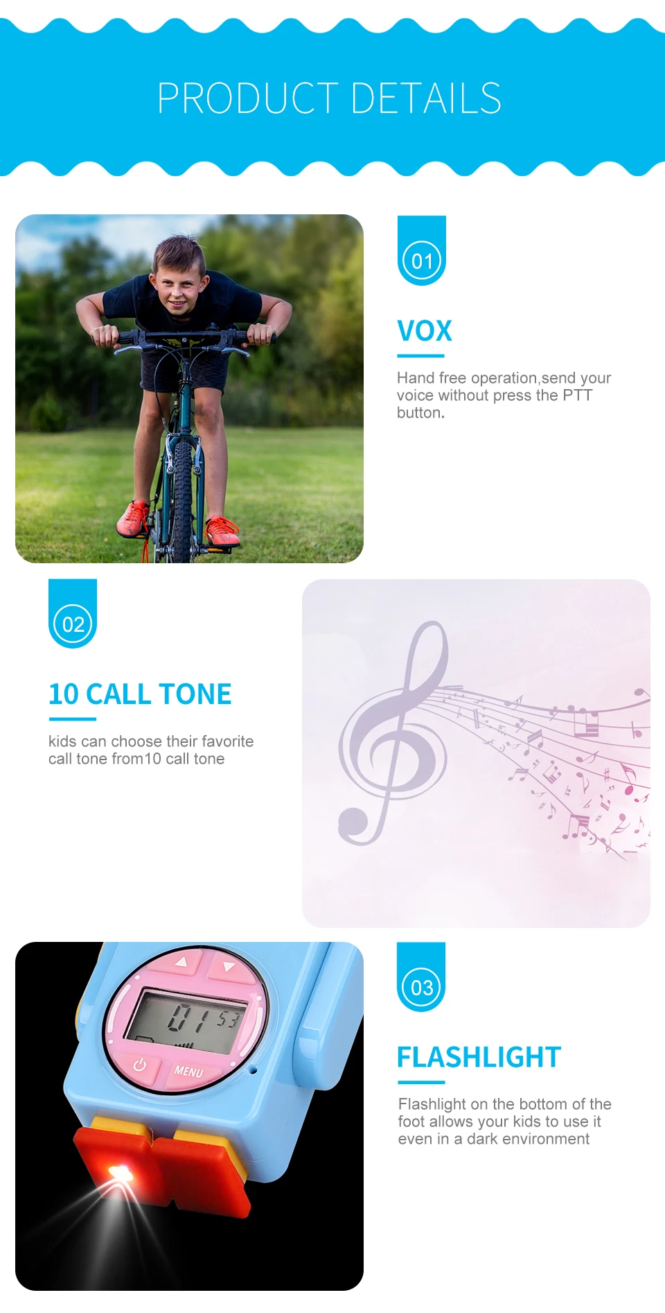 Ручной без поднятия трубки, отправьте Ваш голос без нажмите клавишей PTT во время. Дети могут выбрать свой любимый тонального сигнала вызова from10 тонального сигнала вызова. Фонарик на нижней части стопы позволяет вашим детям использовать его даже в темное время суток.