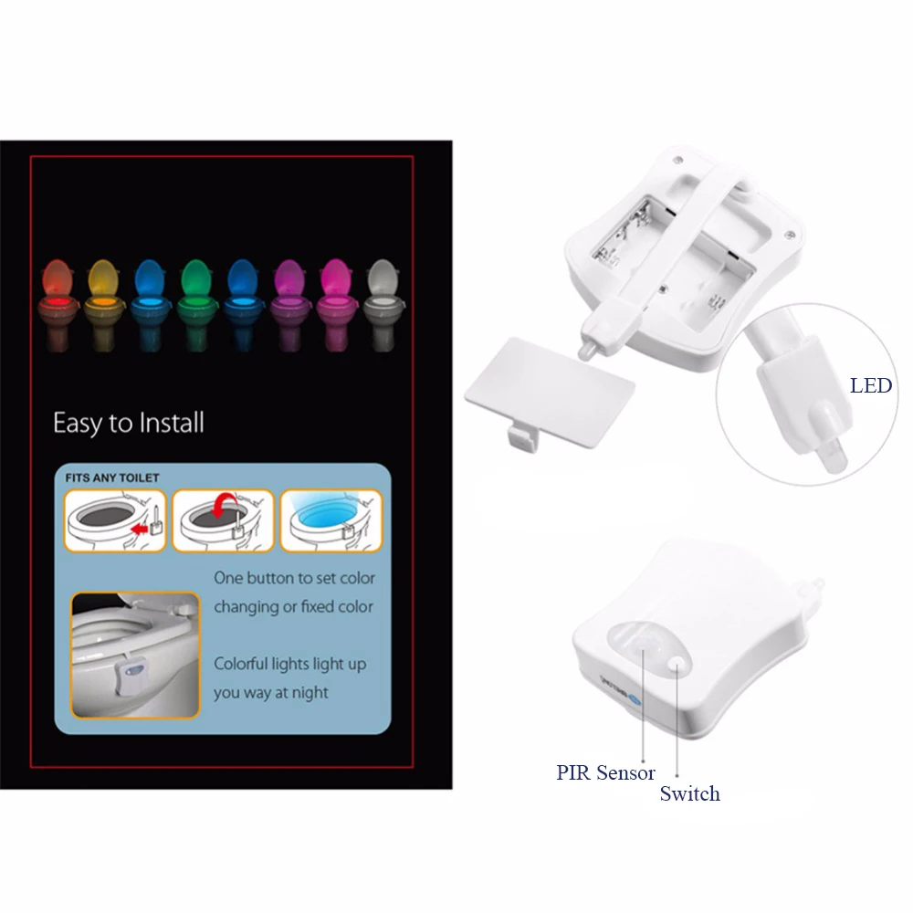 Это ночник с активированным движением, который специально разработан для туалета в темноте, это означает, что он автоматически освещает внутреннюю чашу любого туалета только в темноте, как только вы находитесь рядом с диапазоном около 1 метра вашего туалета. Подходит для любого туалета. Больше не упускайте цель или не спотыкайтесь о ванную комнату в темноте. Нажав на кнопку, вы можете изменить цвета освещения.