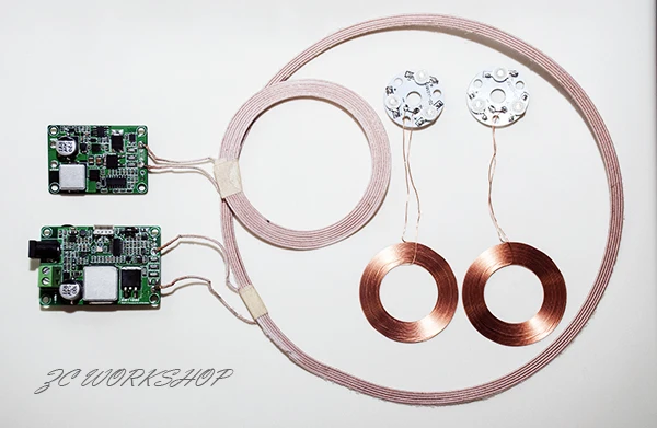 (Голая часть программы по реформированию для передачи энергии на приемный конец, принцип резонансной муфты будет производить переменного напряжения, несколько сотен Вольт в катушке на передатчике и приемнике не прикасайтесь к краю пластины вручную (сторона катушки), будьте осторожны. ^_^ Принимающая катушка не рекомендуется на стороне монтажной платы, и любой металлический материал, конкретное приложение может связаться с продавцом.)