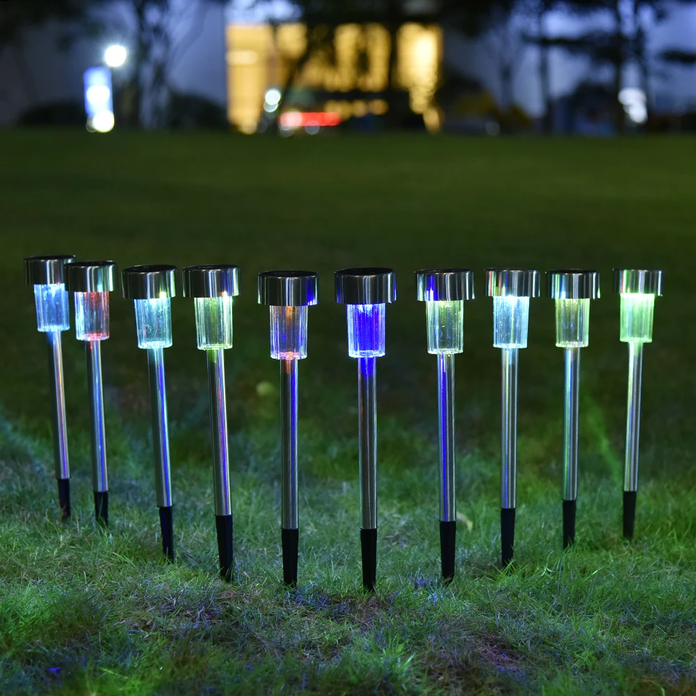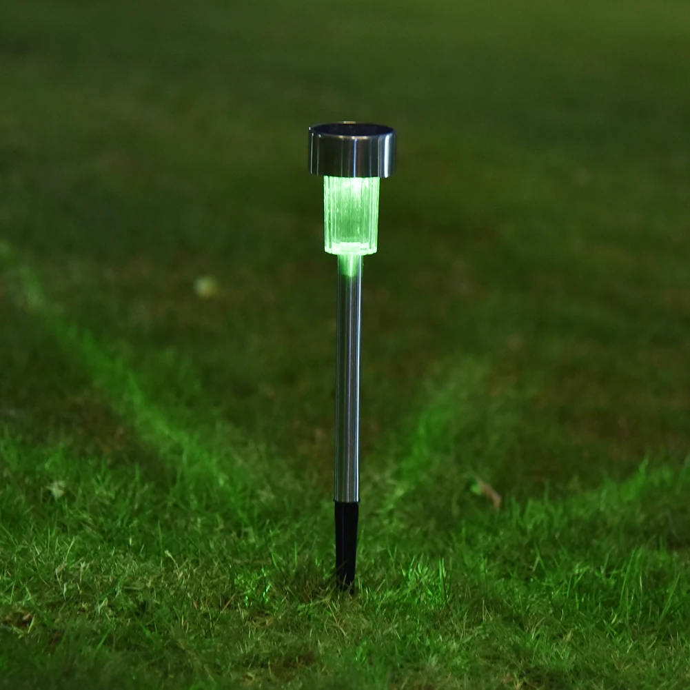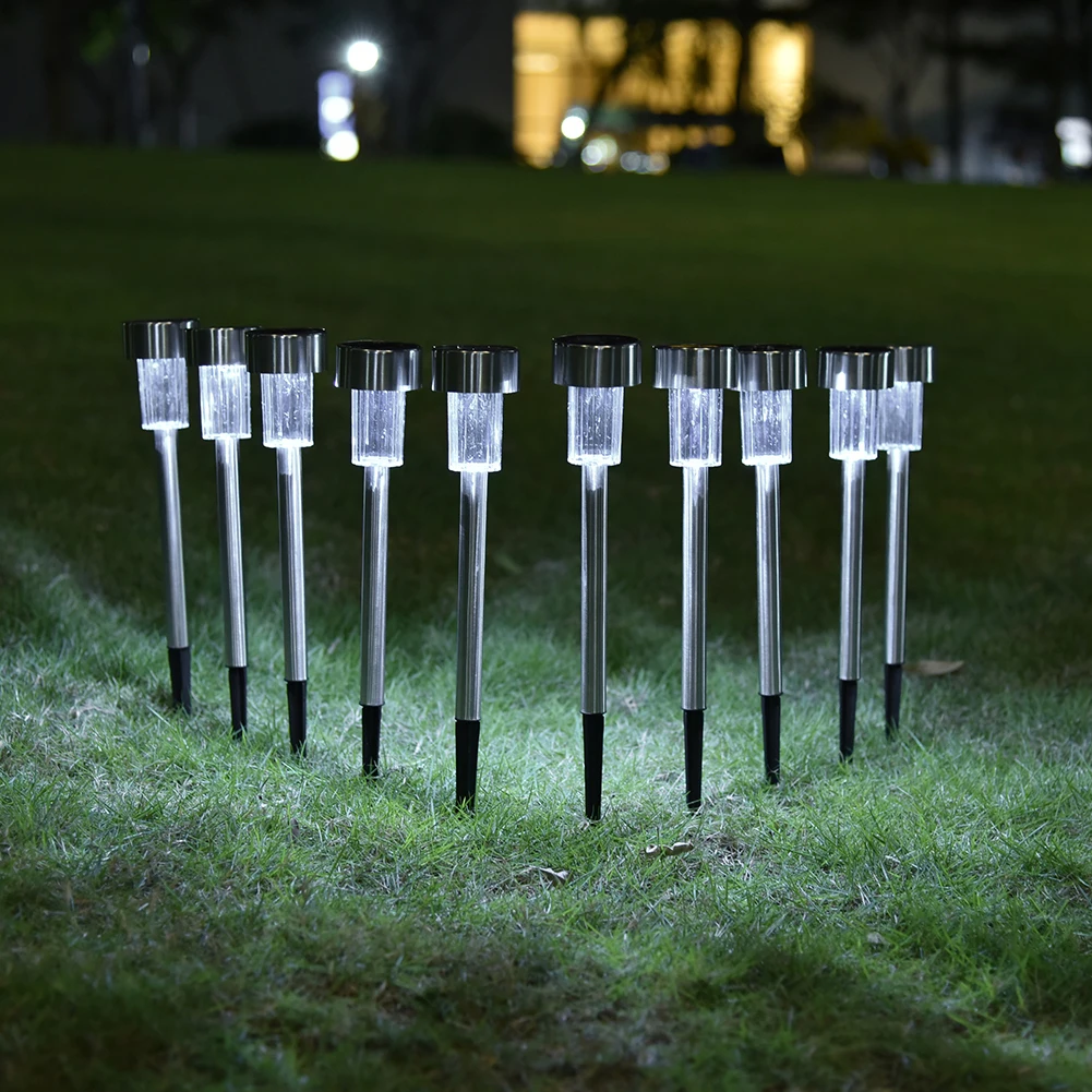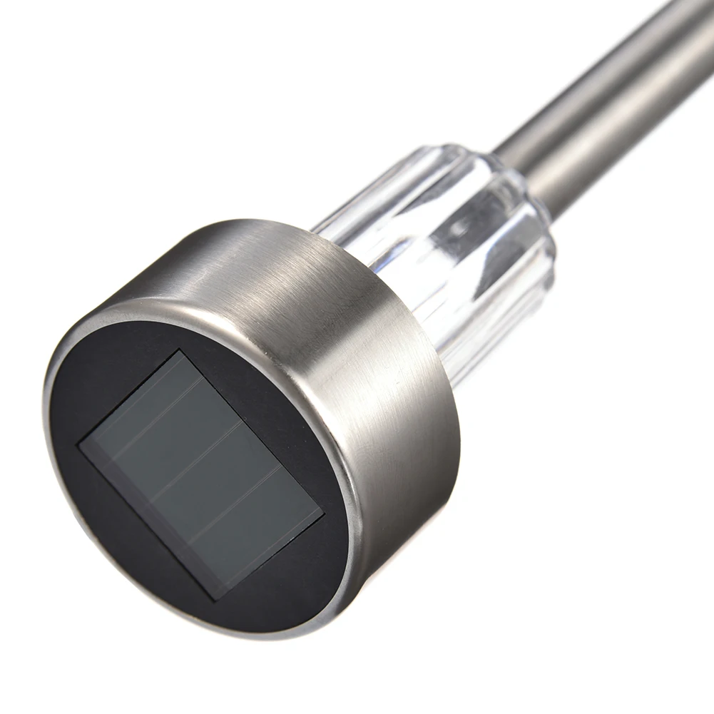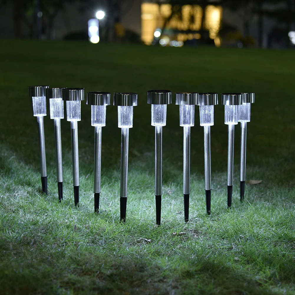 Premium quality stainless steel bright white LED solar lights. Adopt latest improved solar panel, provides better performance and prolonged usage time. The solar panel converts sunlight during the day time and recharge the battery. At night the light turn on automatically. Light assemblies, stake sections, connectors, and durable ground spikes are included. This energy-efficient, low-maintenance solar lights add a charming, decorative glow to your driveway, patio, or flowerbeds.
