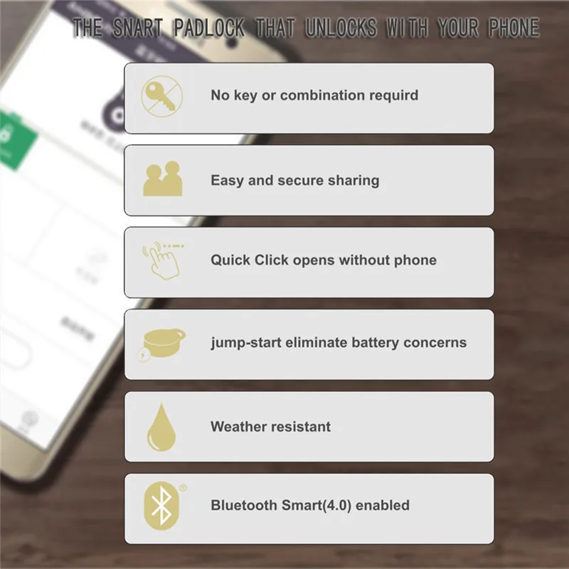 Это наша первая партия замок с Bluetooth управлением, который использует технологию Bluetooth 4,0. Smart phone можно подключить Через приложение Для достижения автоматического управления. Этот смарт-замок идеально совместим с Apple ios7 и Andriod 5,0 выше телефонной системы. Преимущества: 1. Модный дизайн, также может быть приятным подарком. 2. Передовая технология 3. Более быстрое соединение Bluetooth 4. Надежная безопасность5. Чехол из цинкового сплава