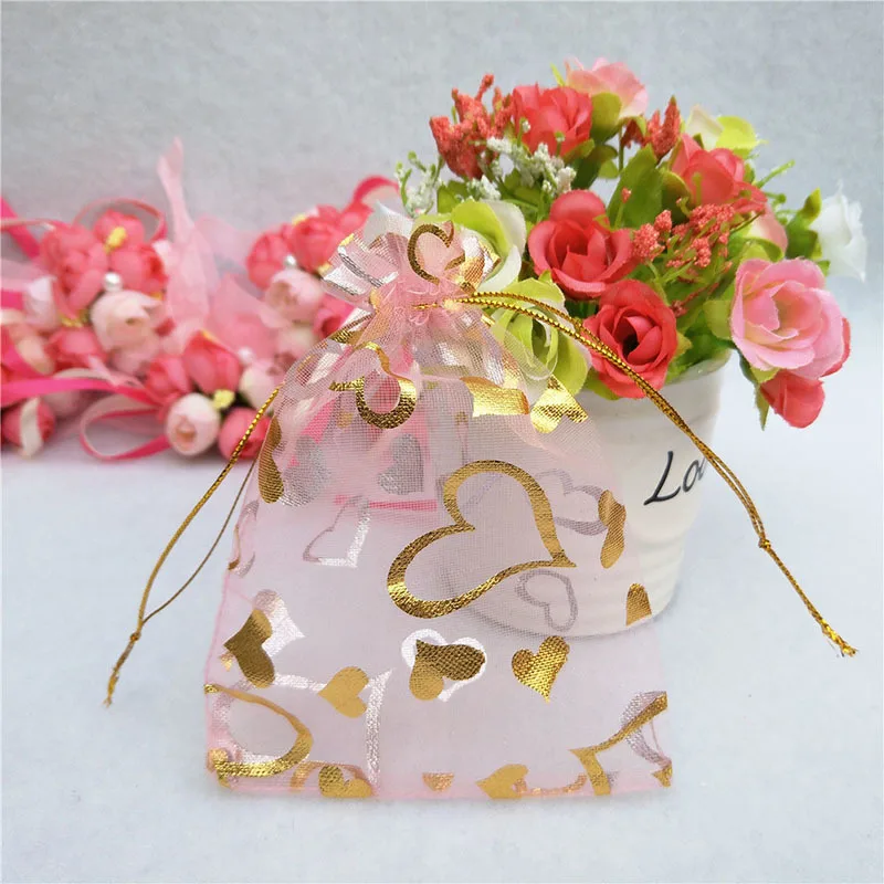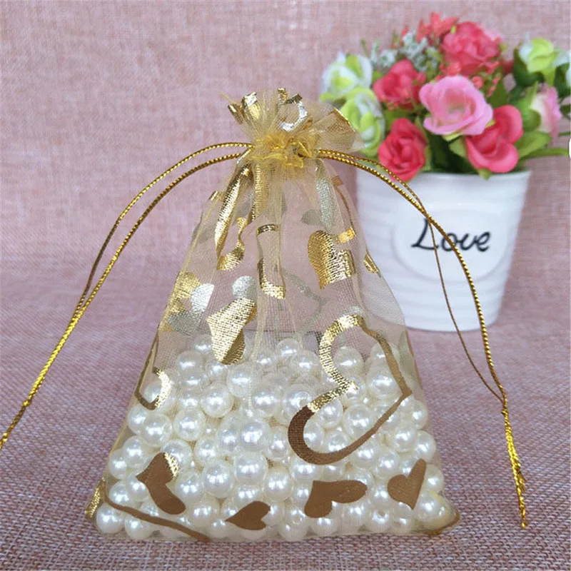 100 шт. 9x12 см мешочки из органзы, ювелирные изделия, конфетная сумка на шнурке, подарочная упаковка Золотого сердца, крафт-сумки для свадебной вечеринки, украшения