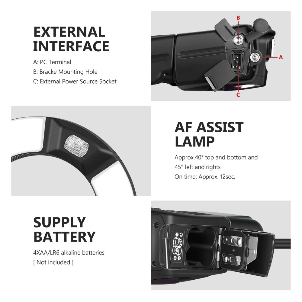 Срок службы батареи: прибл. 100 ~ 800 вспышек (с щелочными батареями AA/LR6)