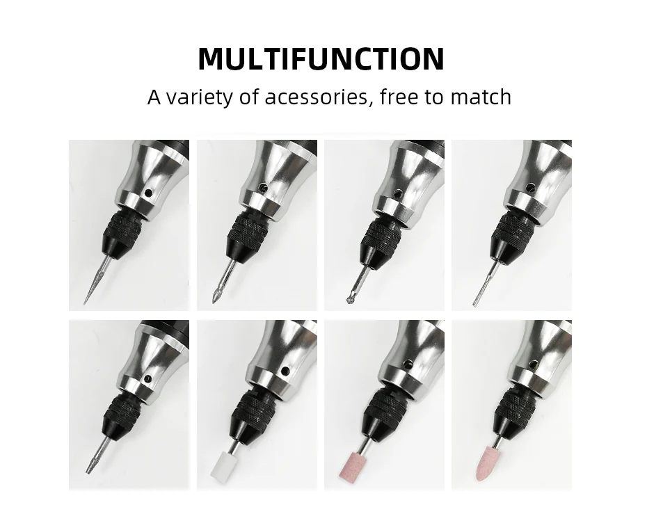 Особенности: Корпус из алюминиевого сплава Маленький размер, светильник небольшой вес, удобная в эксплуатации, легкая для прецизионной работы. Подходит для педикюра и маникюра. С 0,5 мм-3,2 мм патрон и общая шлифовка головы. Вставьте одно сверло для сверления, чтобы зафиксировать Главный шпиндель, чтобы изменить сверло Стандартные аксессуары, простая эксплуатация и удобная установка