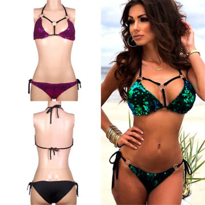 2017 новое поступление сексуальный блестящий золотой зеленый фиолетовые пайетки бикини стринги набор женский купальник бандо Купальники для женщин