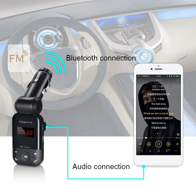 Это Автомобильный MP3-плеер + автомобильный комплект Bluetooth + Автомобильное зарядное устройство, встроенный fm-передатчик и чип декодирования MP3, который может передавать аудио/музыку с usb-диска,