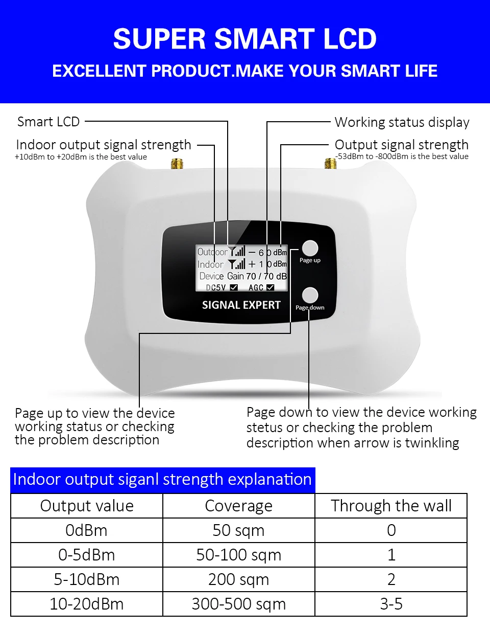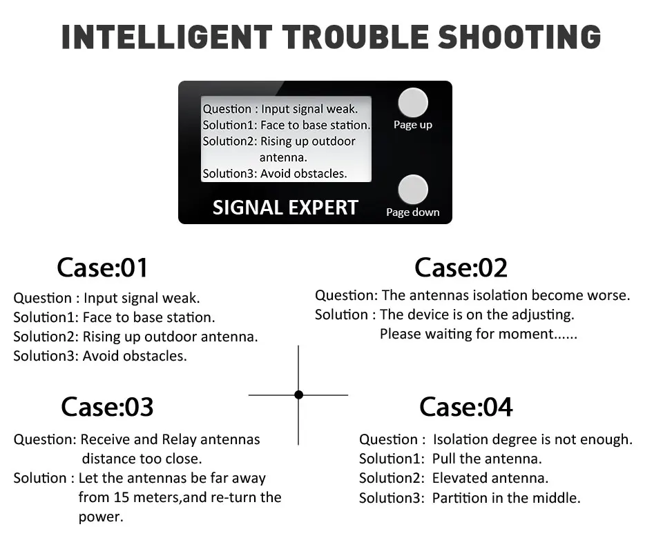 1, умный, чтобы направлять установку с ЖК-дисплеем. 2. В режиме реального времени отображается сила сигнала. 3. Автоматический режим ожидания, когда пользователь не делает вызов. 4. Автоматическая сигнализация при ошибке установки и предоставление соответствующего решения. 5. Автоматическая регулировка коэффициента усиления системы, чтобы избежать самовозбуждения повторителя. 6. Напоминаем о том, когда устройство было повреждено.