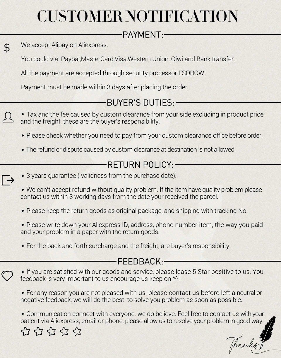 Доставка ● Мы отправим вашу посылку сразу после подтверждения оплаты, в течение 48 часов для нормальных, за исключением выходных и китайских праздников. ● Укажите правильный адрес, полное имя и почтовый индекс. ● Мы обычно декларируем посылку с более низкой стоимостью для aviod или уменьшаем таможенные пошлины. Налог на импорт не включает в цену. Когда это произойдет, покупатель несет ответственность за оплату налога и таможенного оформления. ● Доставка находится вне нашего контроля. Если вы хотите получить товар быстро, пожалуйста, выберите методы быстрой доставки, такие как EMS, UPS и DHL. Если вы обнаружите, что посылка превышает обещанное время доставки, пожалуйста, свяжитесь с нами, мы свяжемся с перевозчиками и выясним причину. Гарантия ● Пожалуйста, обратите внимание, что мы всегда проверяем и тестируем продукт дважды перед отправкой и упаковываем их так же, как и посылка. Если товар поврежден при получении, пожалуйста, свяжитесь с нами, мы отправим вам новый товар. ● Три года для нашего бустера, это ioly 3 месяца для аксессуаров thr. Если у Бустера есть какие-либо проблемы, пожалуйста, покажите нам видео или некоторые фотографии вашей полной установки, мы поможем вам. Пожалуйста, не открывайте спор или не оставляйте негативные отзывы, прежде чем связаться с нами. Мы ответим вам в течение 24 часов, за исключением выходных. Отзывы ● Если вы удовлетворены нашим обслуживанием и продуктом, мы будем очень признательны, если вы поставите нам пять звезд и положительный отзыв. Вы также можете рекомендовать его людям, которые в нем нуждаются. Большое спасибо.
