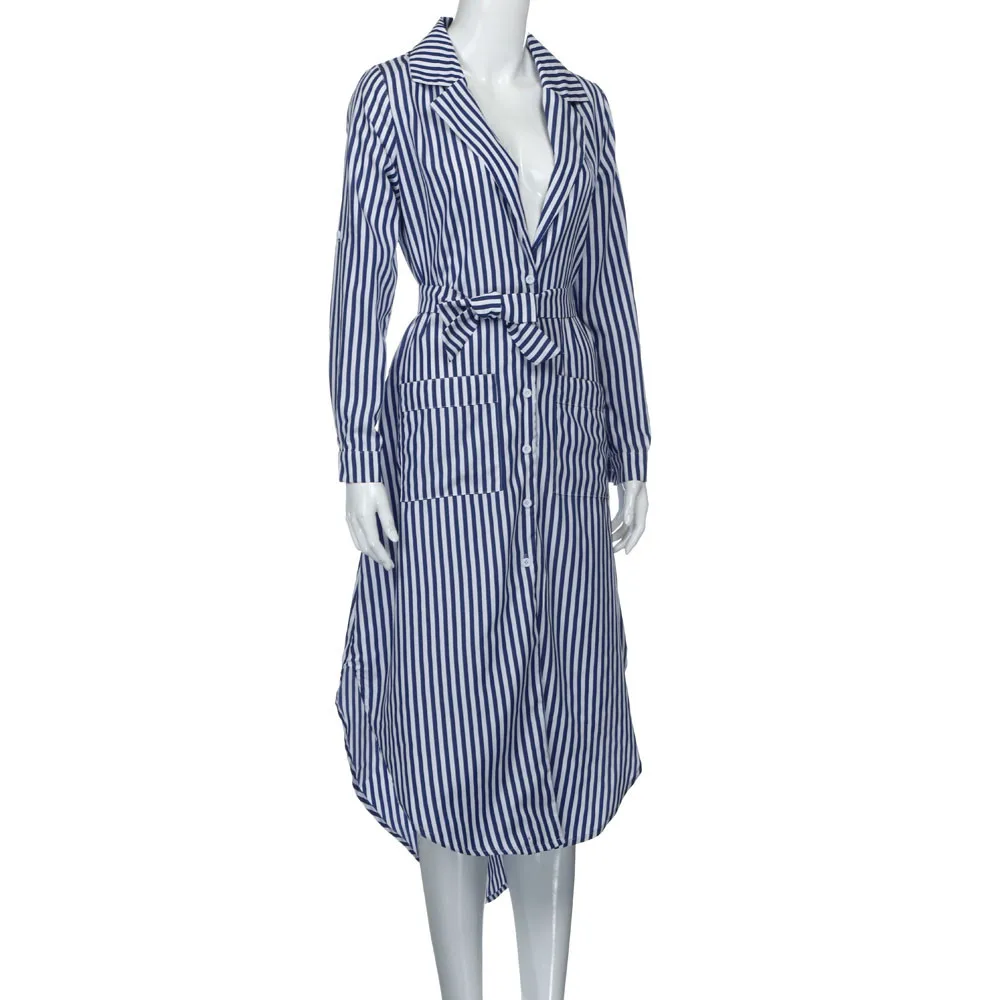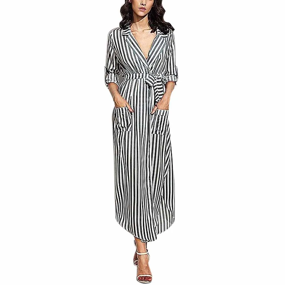 Женский топ в полоску с поясом, глубоким v-образным вырезом и длинным рукавом, Длинное Платье Макси