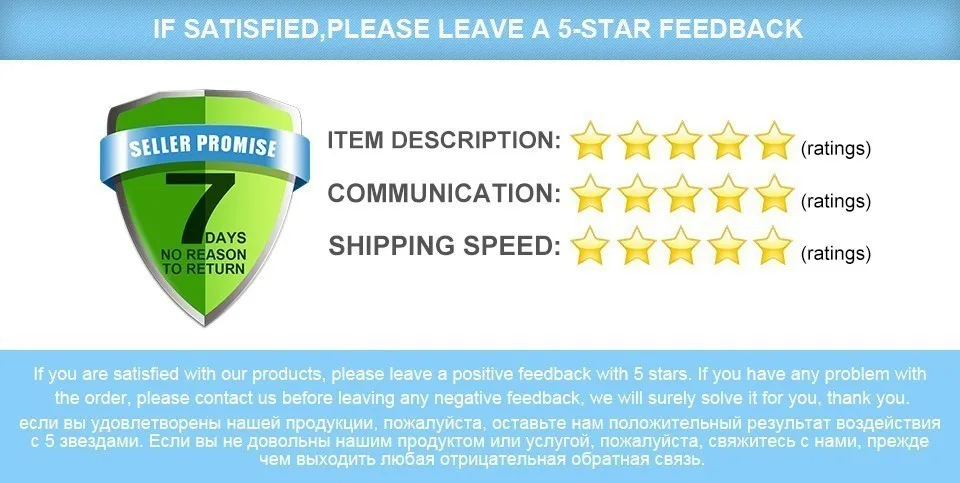 Мы тщательно проверим заказ и посылку, чтобы убедиться, что все в хорошем состоянии перед отправкой. Надеемся, что вы будете удовлетворены нашим общим услуг, а также в качестве продукции и с нетерпением ждем вашего хорошие отзывы. Негативные отзывы/спор не может помочь вам решить любую проблему. Пожалуйста, свяжитесь с нами для решения как можно скорее, если вы обнаружите, что это не соответствует описанию или имеет низкое качество, и мы, конечно, решим его для вас. Между тем, если вы удовлетворены нашей продукцией и обслуживанием, пожалуйста, подтвердите заказ в течение 3 дней после получения вашего заказа и оставьте положительные отзывы с 5-dsr и фотографиями. Благодарим клиентов за поддержку, мы предоставим скидку на ваш следующий заказ, и вы получите VIP Быстрый послепродажный сервис от нас! Надеюсь, у нас есть шанс сделать с вами бизнес :)