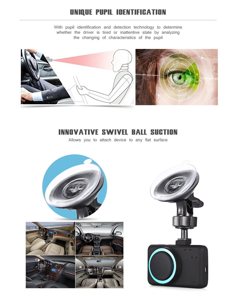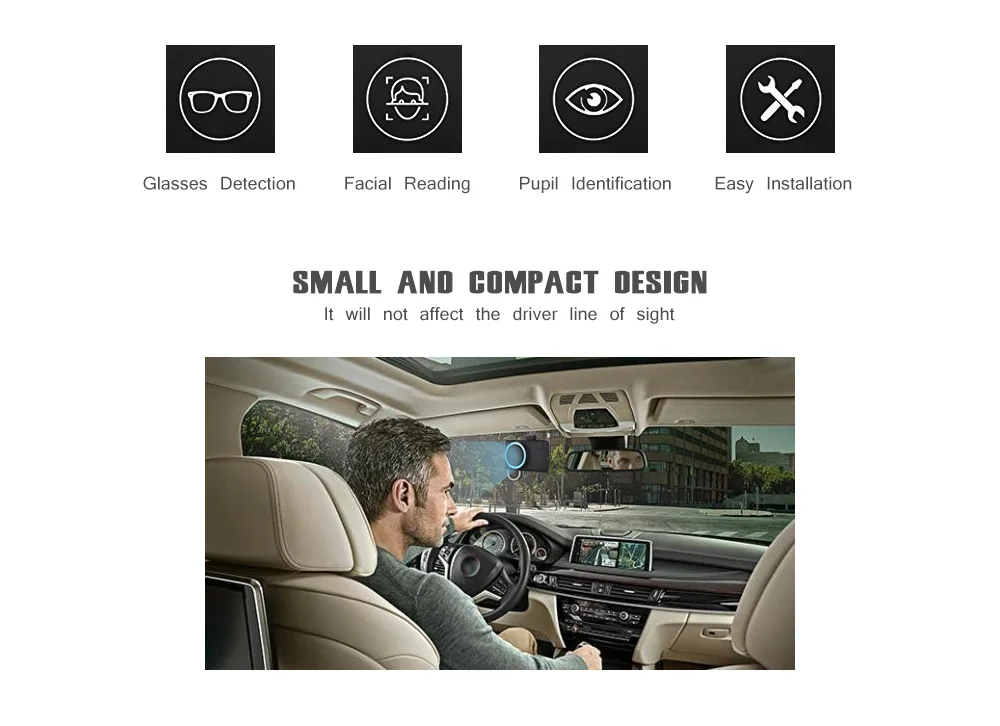 Уникальный ученик идентификации: С технологией идентификации и обнаружения ученика, чтобы определить, утомлен ли водитель или невнимателен, путем анализа изменения характеристик ученика. Как только водитель обнаружит усталость или отвлекается от вождения, он немедленно отправит сигнал тревоги, чтобы напомнить водителю