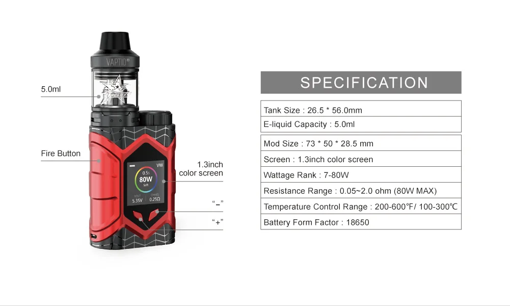 Mod Size: 73*50*28.5mm Tank Size: 23.5*54mm(2ml)/ 26.5*56mm(5ml) Resistance Range: 0.05-3.0ohm Output Wattage: 7-80W Display Screen: 1.3inch Color TFT Output Mode: VW/TC/Smart/CCW/CCT/Bypass