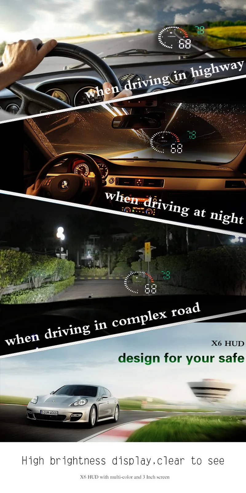 Спасибо за покупку нашего HUD. Этот продукт предназначен для безопасности водителей, особенно в высокоскоростном вождении ночью, HUD может держать водителя в глаза на дороге и может уменьшить автомобильную аварию. HUD может проецировать важную информацию (например, скорость) на лобовое стекло, это может помочь неопытному новичку контролировать свою скорость и избежать Превышение скорости в дороге. Что еще более важно, это позволяет водителю мгновенно считывать номер в большом видении и всегда заставлять водителей следить за дорогой в ясном уме.