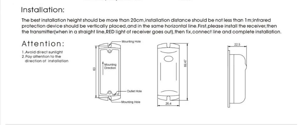 Рабочее напряжение: DC9 ~ 16 В Диапазон обнаружения: 10 м Переключатель мощность на выходе: 1A Max, алюминиевая крышка, 25В Рабочая температура: 25 ℃ ~ + 55 ℃ Размер: 69,5*26,4*26,4 мм