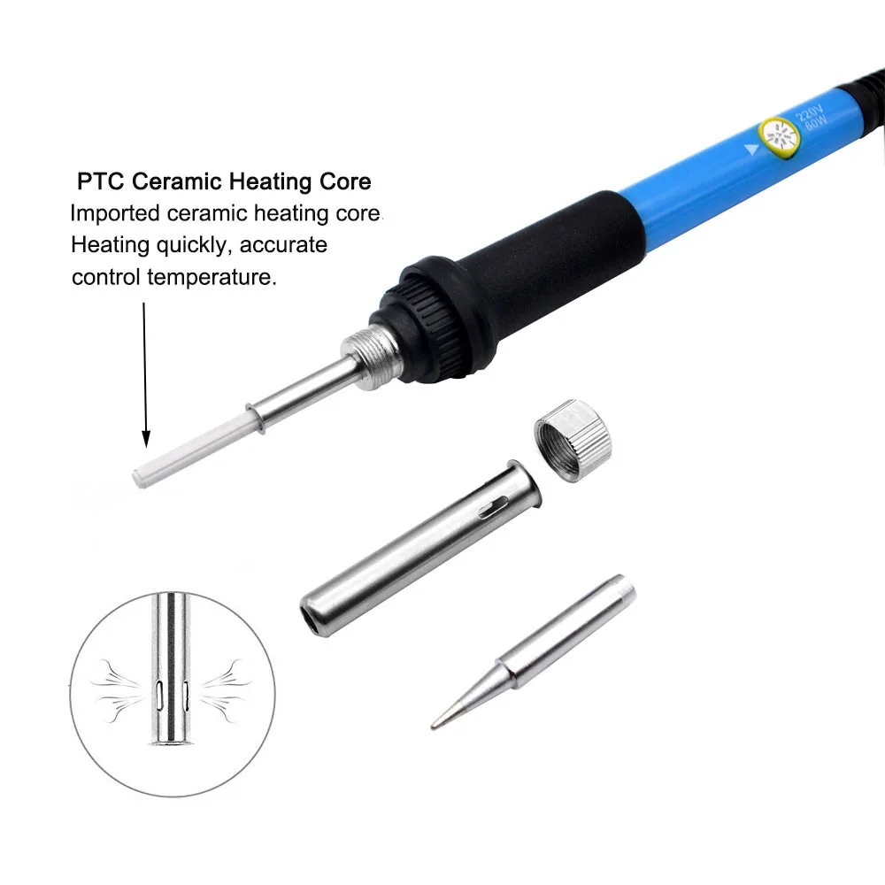 1, полный комплект 12 в 1: этот комплект поставляется с паяльником, 5 запасных наконечников для припоя, 6 инструментов для пайки, устройство для всасывания олова, антистатические пинцеты, y-образный паяльный стенд и так далее, полный спектр, прост в использовании.