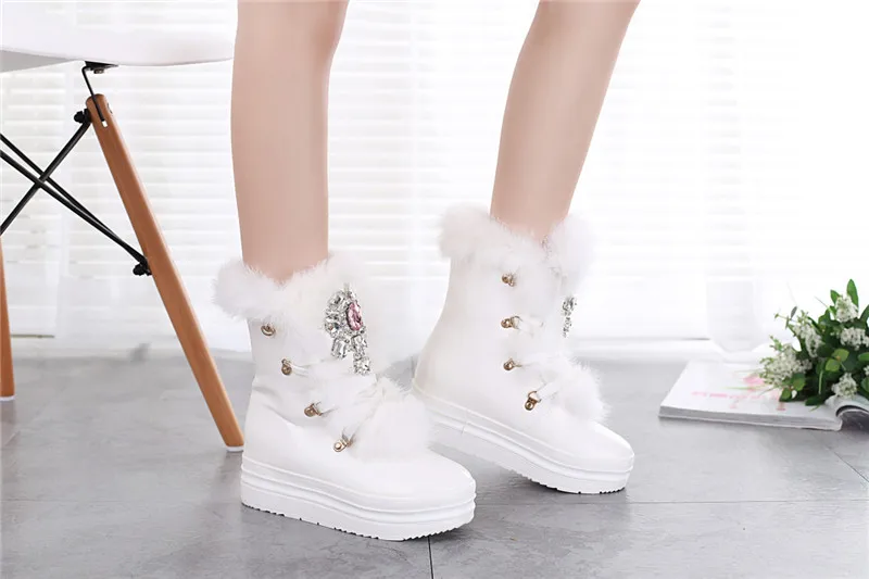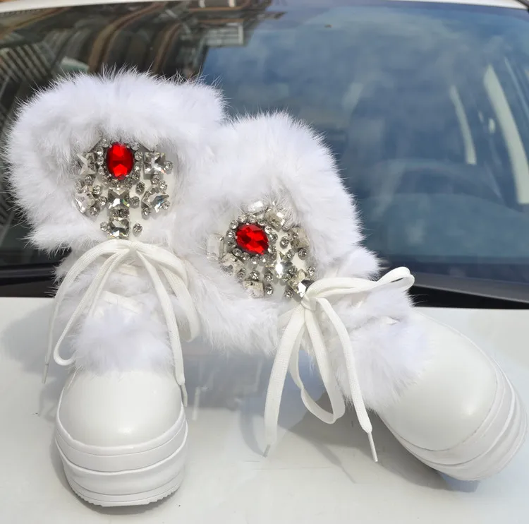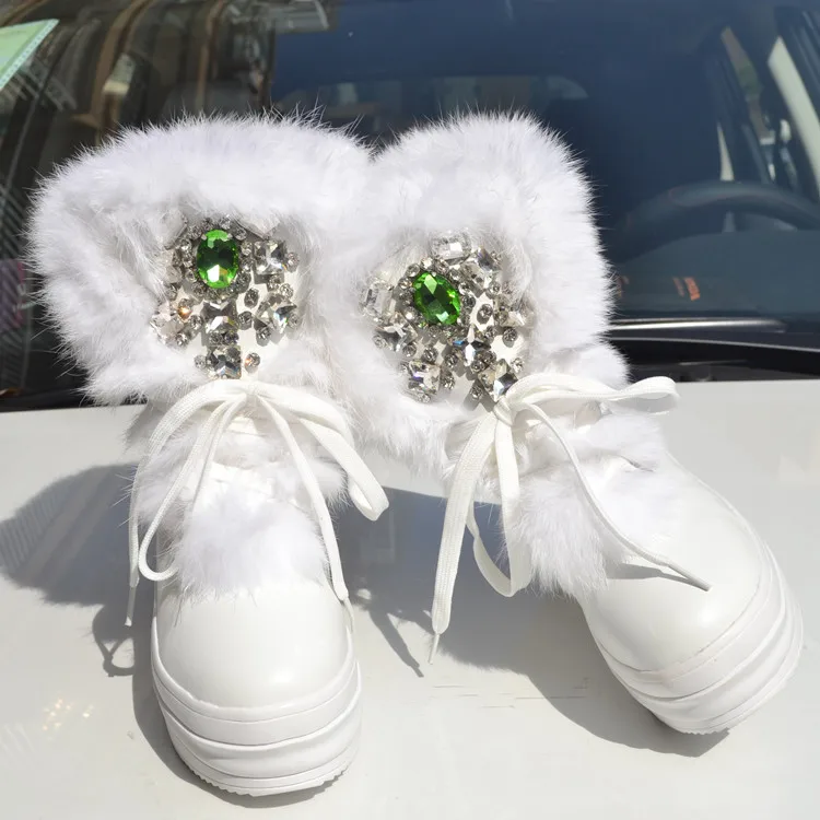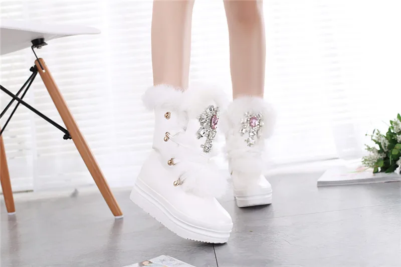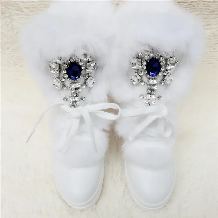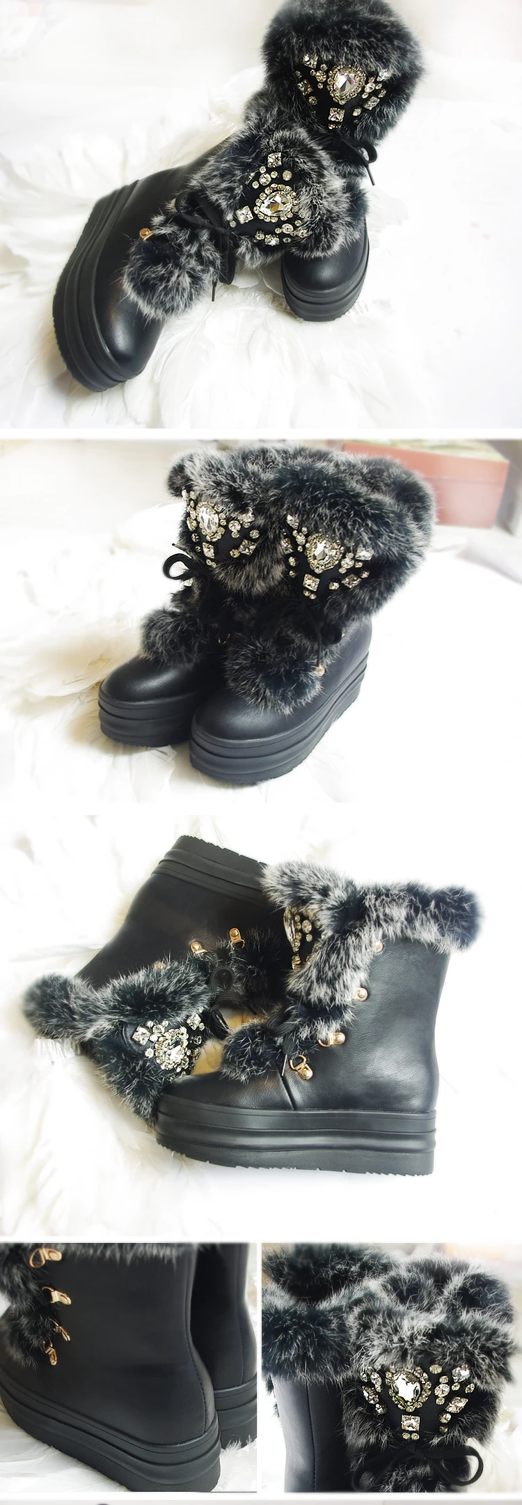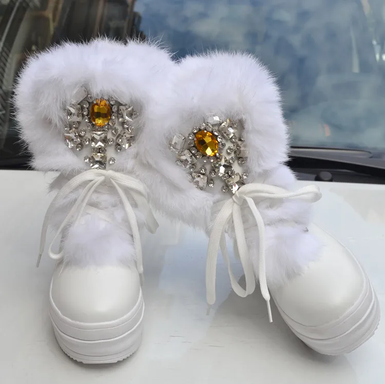 2018 зимние теплые стразы; Женские ботинки ручной работы со стразами; Обувь на платформе с натуральным кроличьим мехом; Новинка; Женская обувь на плоской подошве со стразами
