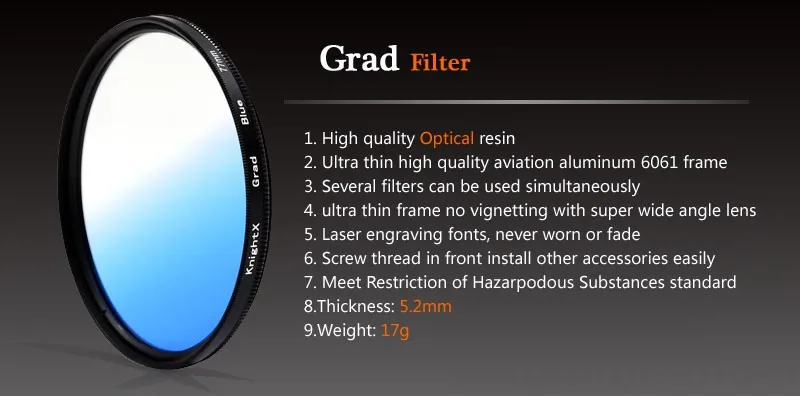 Держатель градиентного фильтра Конструкция постепенно уменьшаются рядом с центром фильтра, что позволяет сделать упор на передних и задних фотографиях.Цвет линз постепенно исчезает, поэтому граница между окрашенными и прозрачными секциями линз не станет заметной даже при остановке диафрагмы объектива. Данный фильтр устанавливается на вращающуюся раму, поэтому вы сможете поворачивать окраску в любой части вашего изображения. Придает вашему ландшафту и текстуре кожи более яркий вид. Материал:Оптическая смола