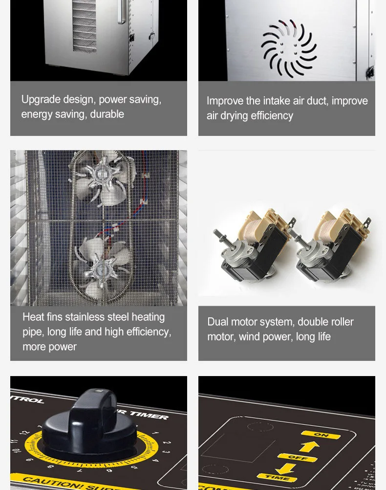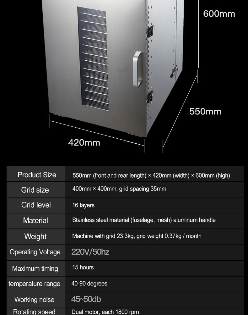 Размер изделия: 550 мм (длина спереди и сзади) × 420 мм (ширина) × 600 мм (высота) Размер сетки: 400 мм × 400 мм, расстояние между сеткой 35 мм Уровень сетки: 16 слоев Материал: нержавеющая сталь материал (fuselage, mesh) алюминиевая ручка Рабочее напряжение: 220 В/50 Гц Максимальное время: 15 часов Температурный диапазон: 40-90 градусов Цельсия Рабочий шум: 45-50db Скорость вращения: двойной мотор, каждый 1800 об/мин Продукт Особенности: 15 часов таймера, больше подходит для длительной сушки пищи Увеличьте нормально открытую функцию, устраняя необходимость в долгосрочном использовании работы человека Высокочувствительный контурный контроль температуры с горячей компенсации, температура более точная Прозрачная визуальная конструкция двери, в соответствии с сушильным режимом в любое время для регулировки 16 слоев для удовлетворения ваших бизнес-потребностей Обновленный дизайн, энергосбережение, энергосбережение, прочный Улучшите воздухозаборник, улучшите эффективность сушки воздуха Тепловые плавники из нержавеющей стали нагревательные трубы, длительный срок службы и высокая эффективность, больше мощности Двухмоторная система, двойной привод ролика, ветровая мощность, длительный срок службы