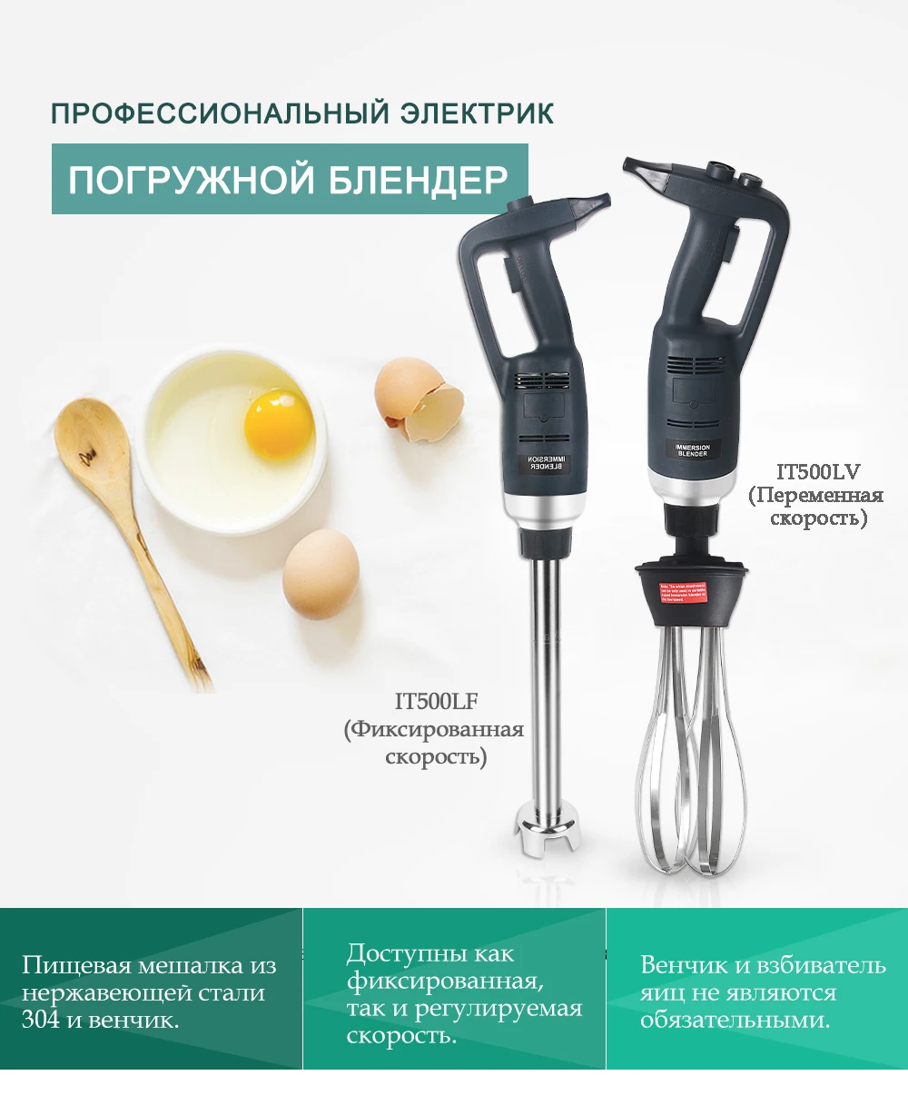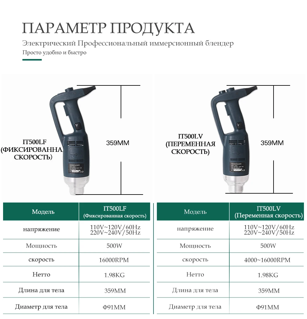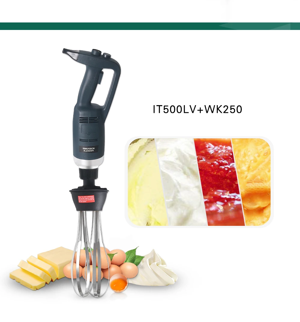 Модель: IT500LV/ IT500LF Напряжение: 220 ~ 240V/50 Гц, 110 В/60 Гц Мощность: 500W Скорость: 4000 ~ 16000 об/мин Вес нетто: тела 1,76 кг + блендер 0,69 кг Длина для тела: 359 мм Диаметр для тела: φ91mm Длина для блендера: 200 мм/250 мм/300 мм/400 мм/500 мм Диаметр для блендера: φ35mm Тип: Переменная скорость/фиксированная скорость Блендер функция: Для более эффективного контроля, мы рекомендуем вам держать гибочное устройство за ручку и нижней части моторный блок. Кроме того, мы рекомендуем вам наклонить Бендер под небольшим углом для того, чтобы предотвратить звонок от прикосновения к нижней части контейнерных перевозок. Обязательно убедитесь в том, что колокольчик достаточно загружен, чтобы избежать попадания и вентиляционные отверстия двигателя Блок не соприкасается с каким-либо жидкостью. Для оптимальной эффективности, две трети трубки должна быть погружена в подготовки.