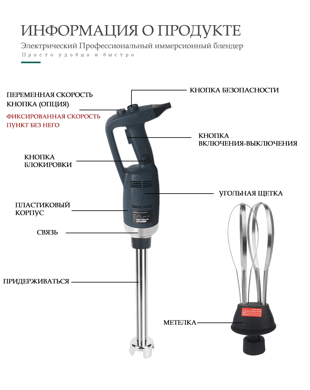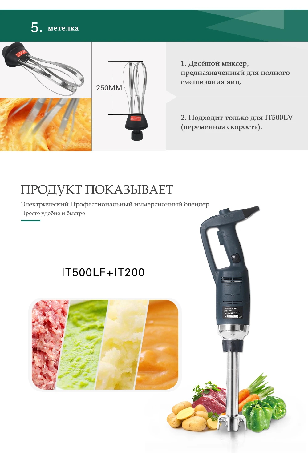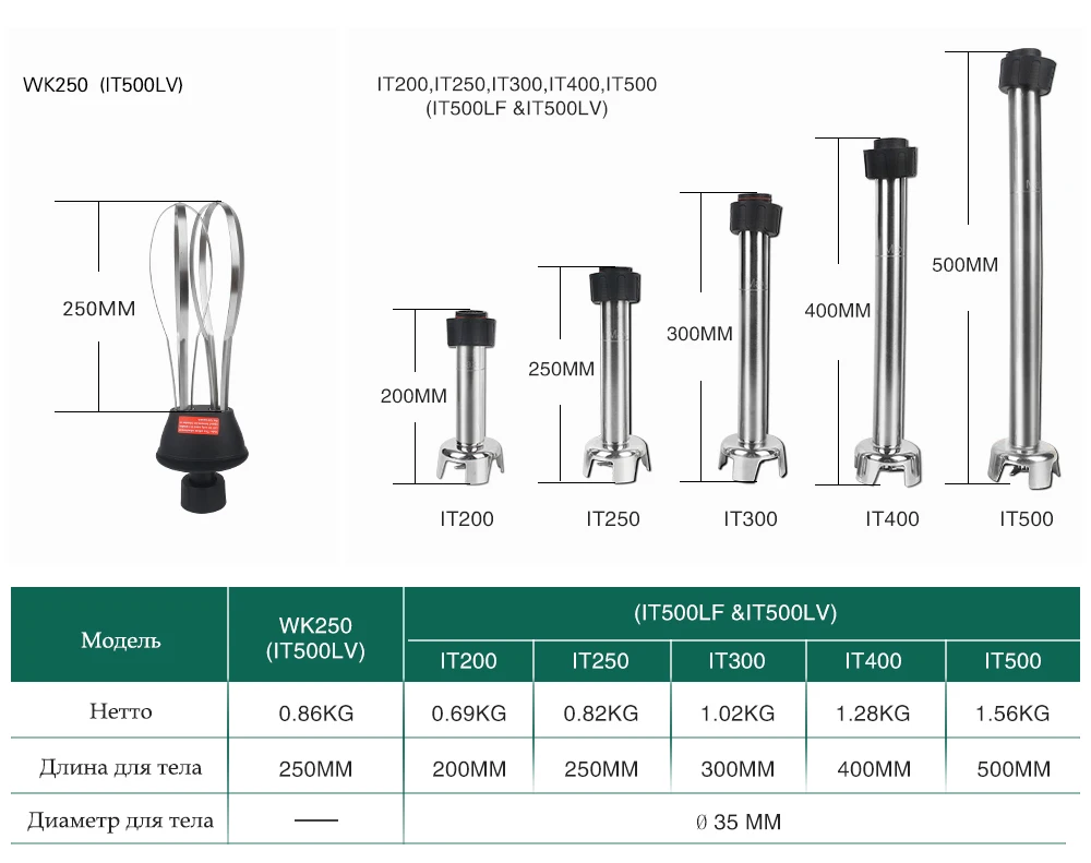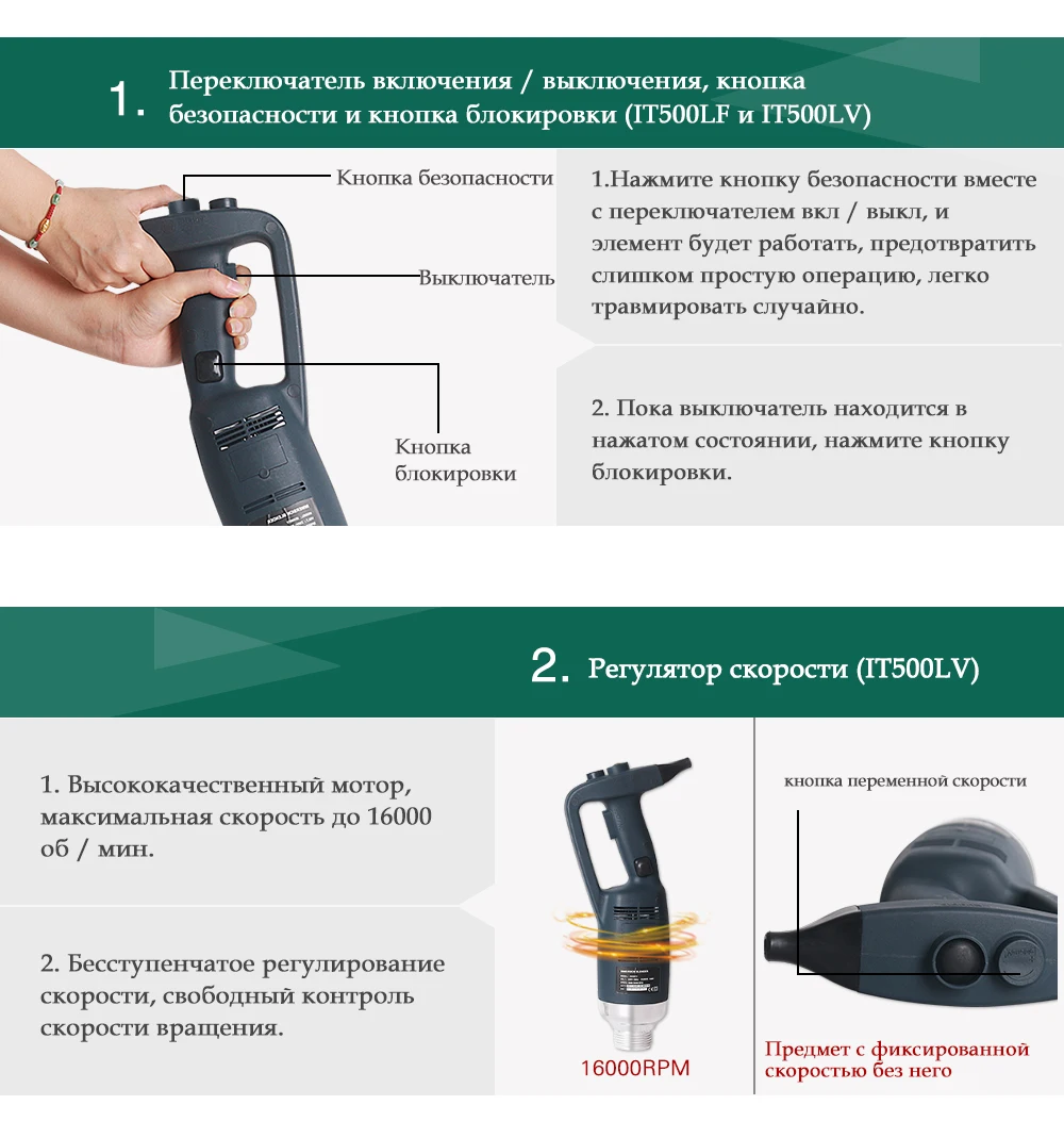 Модель: IT500LV/ IT500LF Напряжение: 220 ~ 240V/50 Гц, 110 В/60 Гц Мощность: 500W Скорость: 4000 ~ 16000 об/мин Вес нетто: тела 1,76 кг + блендер 0,69 кг Длина для тела: 359 мм Диаметр для тела: φ91mm Длина для блендера: 200 мм/250 мм/300 мм/400 мм/500 мм Диаметр для блендера: φ35mm Тип: Переменная скорость/фиксированная скорость Блендер функция: Для более эффективного контроля, мы рекомендуем вам держать гибочное устройство за ручку и нижней части моторный блок. Кроме того, мы рекомендуем вам наклонить Бендер под небольшим углом для того, чтобы предотвратить звонок от прикосновения к нижней части контейнерных перевозок. Обязательно убедитесь в том, что колокольчик достаточно загружен, чтобы избежать попадания и вентиляционные отверстия двигателя Блок не соприкасается с каким-либо жидкостью. Для оптимальной эффективности, две трети трубки должна быть погружена в подготовки.