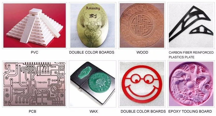 1500 Вт и 2200 Вт:( VFD машина с водяным охлаждением, особенно для длительной непрерывной обработки) ПВХ, акрил, пластик, печатная плата, IC шлифовка, двойная цветная пластина, EVA пена, углеродное волокно, доска из стекловолокна, графит, бакелит, деревянная модель, твердая древесина, твердая древесина, и меди, стали, железа, алюминиевого сплава, нефрита и жадеита и т. Д.
