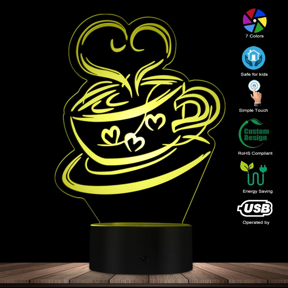 3D светодиодный светильник Coffee Cup-это сочетание искусства и технологии, которая создает оптическую 3D иллюзию и воспроизводит трюки на глазах. Издалека вы увидите дизайн, но по мере приближения вы увидите тонкий акриловый стеклянный лист, который полностью плоский. Он должен ослепить и произвести впечатление на ваших гостей, постоянно освещая комнату и вашу жизнь. Этот игривый продукт сочетает в себе мужские волокна с натуральными материалами и производится с использованием как машин, так и ручной работы. Идеально подходит для отображения в вашей спальне, гостиной, офисе, в качестве ночной лампы или любым способом, который вы хотите использовать.