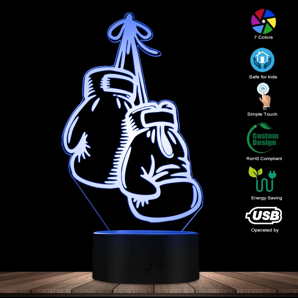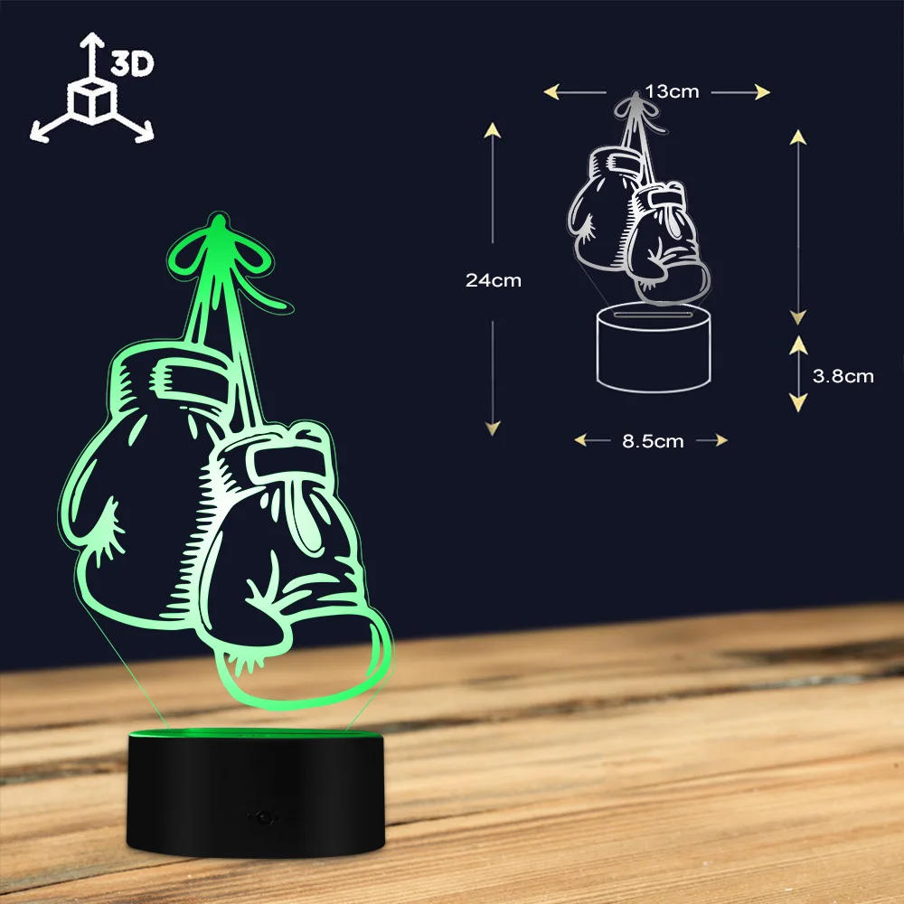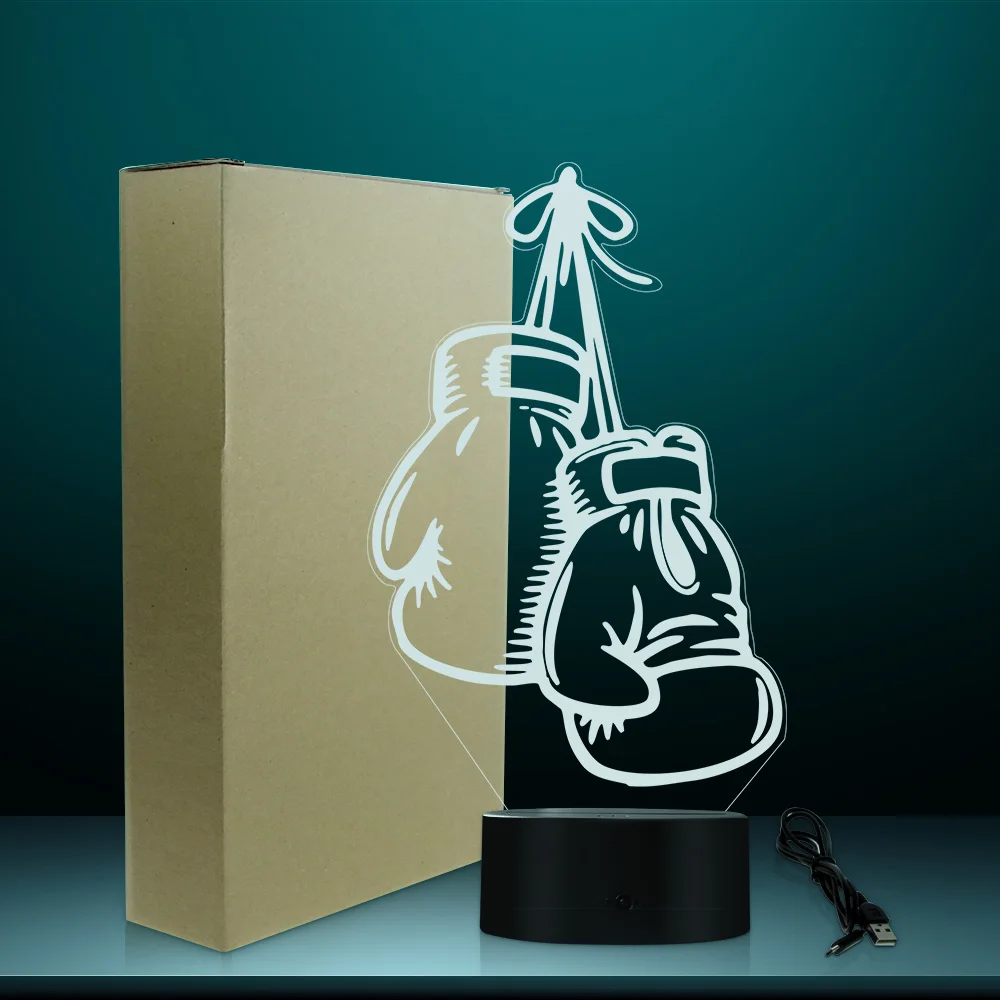 3D светодиодный светильник для боксерских перчаток-это сочетание искусства и технологии, которая создает оптическую 3D иллюзию и воспроизводит трюки на глазах. Издалека вы увидите дизайн, но по мере приближения вы увидите тонкий акриловый стеклянный лист, который полностью плоский. Он должен ослепить и произвести впечатление на ваших гостей, постоянно освещая комнату и вашу жизнь. Этот игривый продукт сочетает в себе мужские волокна с натуральными материалами и производится с использованием как машин, так и ручной работы. Идеально подходит для отображения в вашей спальне, гостиной, офисе, в качестве ночной лампы или любым способом, который вы хотите использовать.