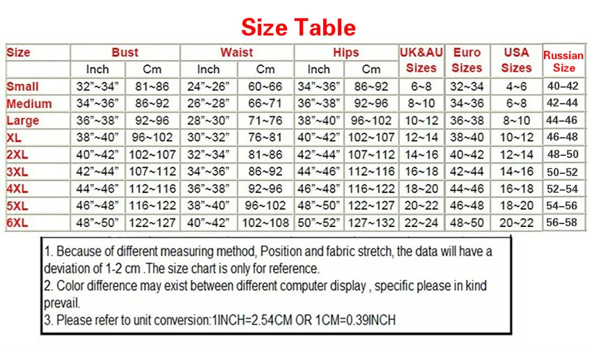(1) из-за различных методов измерения, положения и растягивания ткани, данные будут иметь отклонение в 1-2 см. Таблица размеров приведена только для справки.