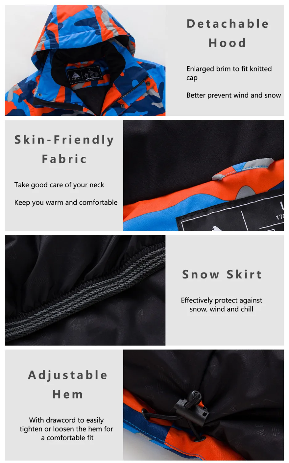 * Съемная Зимняя юбка-помогает предотвратить попадание снега в куртку, если вы принимаете барабаны. Съемная зарядка через для большей гибкости