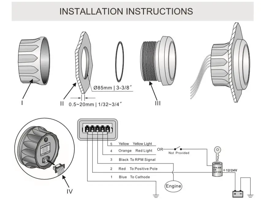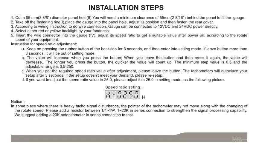 -Фиксирующий Размер: 85 мм (3-3/8 ")-Диапазон индикации: 0-6000 об/мин-Соотношение скорости: 0,5-250,0-Рабочее напряжение: 12 В/24 В-Рабочая температура: -40 °C ~ + 85 °C-Выбор между Красной и Желтой подсветкой-Режим работы: ЖК-дисплей, шаговый двигатель-Класс защиты IP67, весь корпус полностью водонепроницаемый-Отличная функция защиты от запотевания-Безель из нержавеющей стали 316 с изогнутым стеклом-Удобная установка с помощью нескольких разъемов