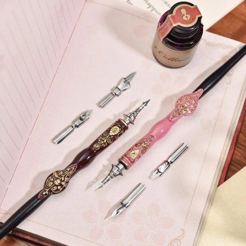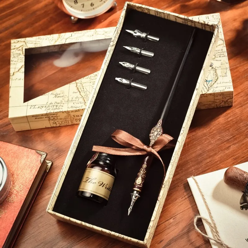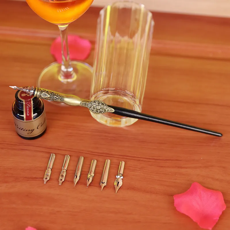 Наборы резных перьев в европейском стиле и 5 различных толстых наконечников из нержавеющей стали (произвольно) и чернильных перьев, популярны в Европе и Америке, тонкая работа, элегантное украшение, это редкая старинная настоящая надпись. Вы можете написать английский curlycue,Италия, готика, плоская точка, вы также можете рисовать,Популярные ностальгические инструменты для письма люди и Поклонники аниме ищут и ценят