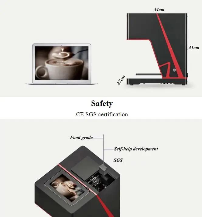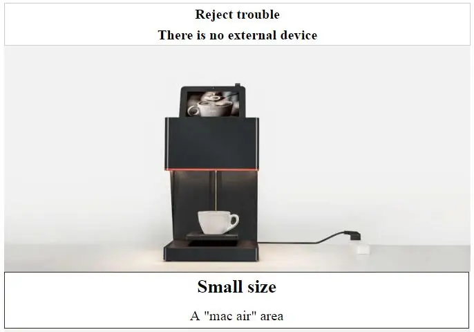 «Cino coffee printer»-это сочетание 3d-печати и струйной технологии кофемашины. Пользователям нужно только положить кофе на цветочную машину, а затем через мобильный телефон загрузить любой желаемый узор, подождите 20 секунд, вы можете получить чашечку кофе с пользовательским узором.