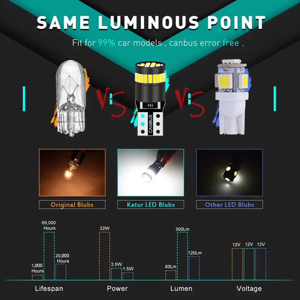 1. Canbus, без ошибок, без ошибок, встроенные резисторы нагрузки Canbus, чтобы избежать кодов ошибок на европейских транспортных средствах 2. Более светильник отдача с 24 ЧИПАМИ 3014 SMD, 60% улучшают светоотдачу, на 30% ярче, чем галогенные 3. Стандарт T10, на 99% близок к оригинальным галогенным лампам 4. Мини-размер близкий к 1:1, размер почти такой же, как галоген, удобно устанавливать, подключи и играй