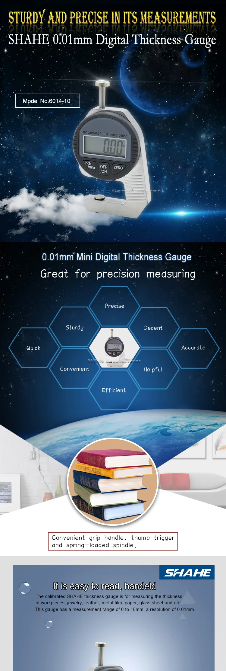 1. Большой ЖК-дисплей для удобного чтения 2. Легкий и портативный 3. Новый дизайн, большое окно отображения 4. Для измерения толщины бумаги, кожи, ювелирных изделий, листового металла и т. д. 5. Функции/ручное включение/выключение или автоматическое отключение, установка нуля в любом положении, перевод метрических/дюймовых систем в любом положении