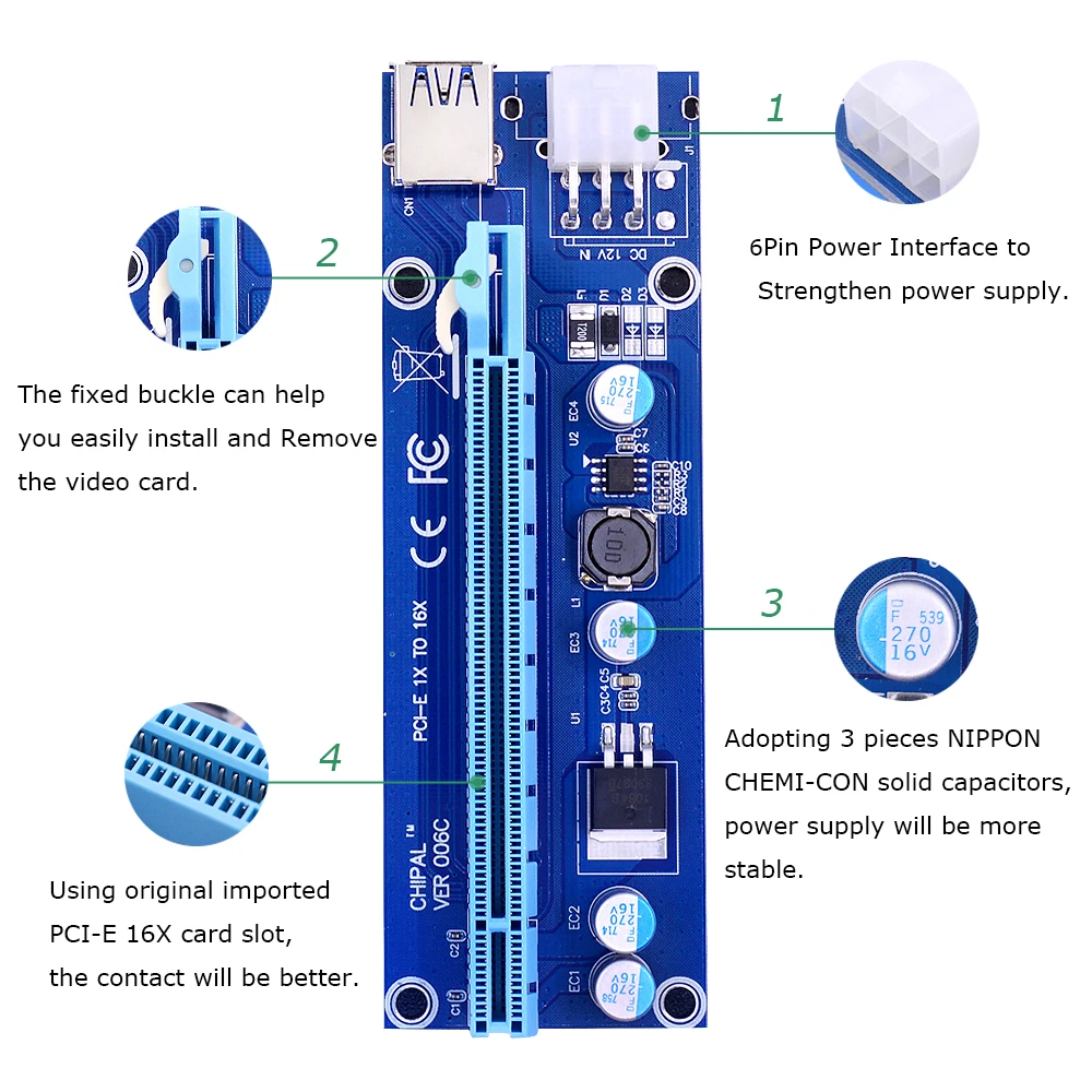 6. Совместим с разъемом 1х, 4x, 8x, 16x PCI-E материнской платы.