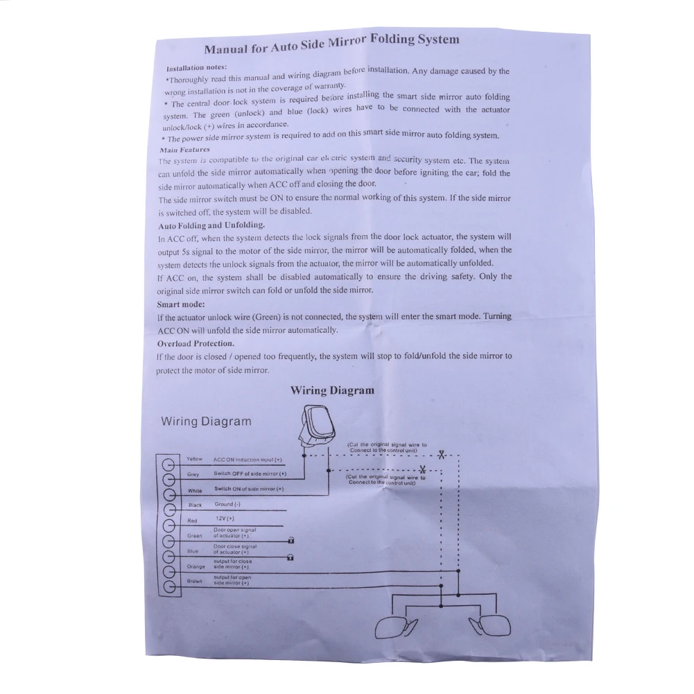 Система совместима с электрической системой и системой безопасности оригинального автомобиля. Система может автоматически открывать зеркало заднего вида, когда дверь открывается, прежде чем зажечь автомобиль, и автоматически складывать зеркало заднего вида, когда АКК закрыт и дверь закрыта. Автоматическое Складывание/разворачивание, эффективная защита от царапин и столкновений. Умный режим, если привод № 6 двери открытый сигнал (зеленый) не подключен, система войдет в умный режим. Включение ACC автоматически включит зеркало заднего вида. Рекомендуется подключить. Защита от перегрузки, если дверь слишком часто закрывается/открывается, система перестанет складывать/раскладывать зеркало заднего вида для защиты двигателя зеркала заднего вида. Простота установки, нет необходимости менять любые оригинальные автомобильные серии и настройки. Коробка может быть скрыта в центральной консоли. Внимание: 1. Пожалуйста, убедитесь, что в вашем автомобиле имеется оригинальная система переключения зеркала заднего вида. 2. Переключатель бокового зеркала должен быть включен, чтобы убедиться, что система работает нормально. Если переключатель зеркала заднего вида выключен, система будет отключена. Посылка: 1 * зеркало заднего вида автоматически блокирует модуль складной системы 1 * провод 1 * Руководство пользователя