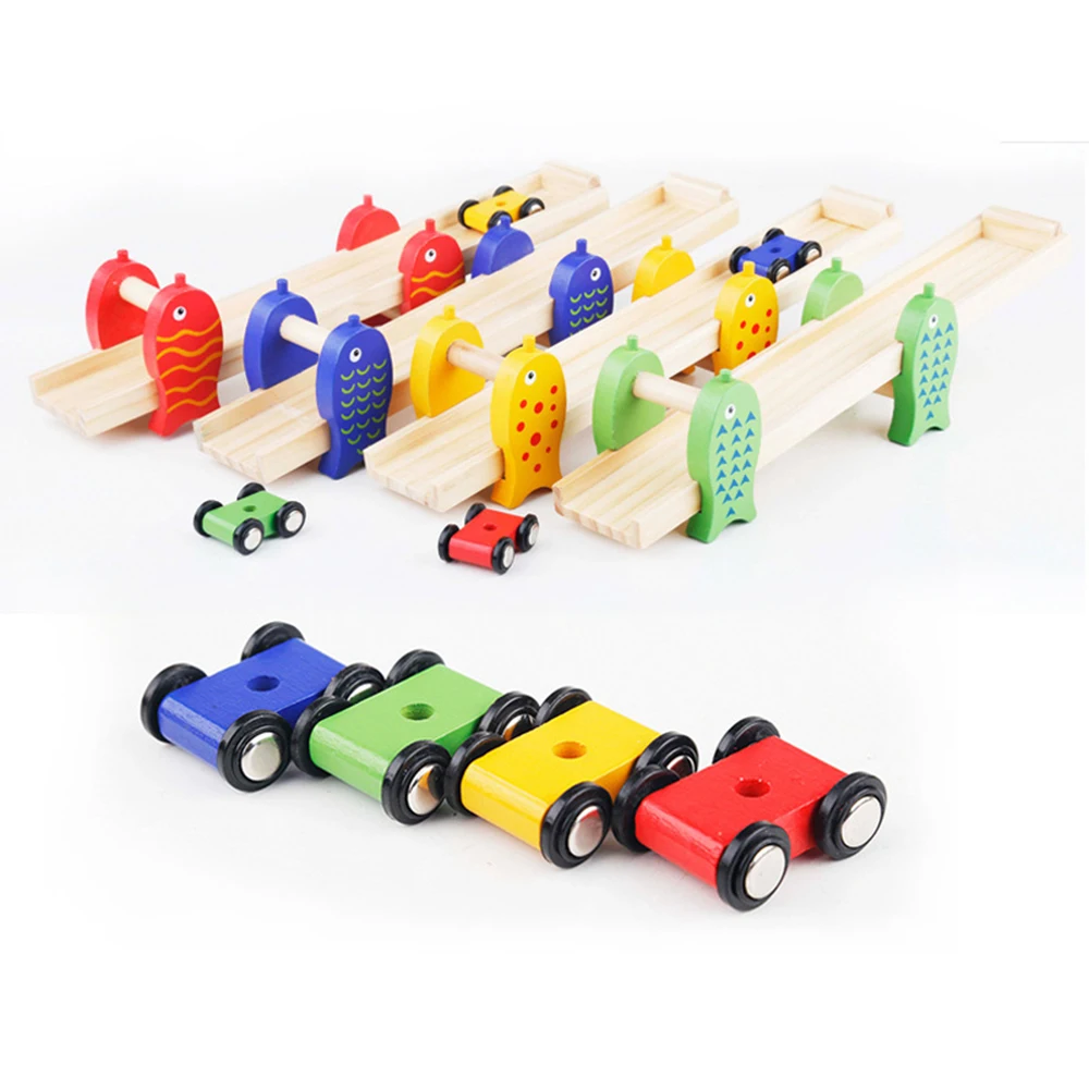 Деревянный скользящий автомобиль на дорожке: деревянные скользящие автомобили скользят по дорожке, и когда он дойдет до конца, они перевернутся, а затем свернутся другим способом. В комплекте с 4 автомобилями, которые сидят в холдинговой бухте наверху.