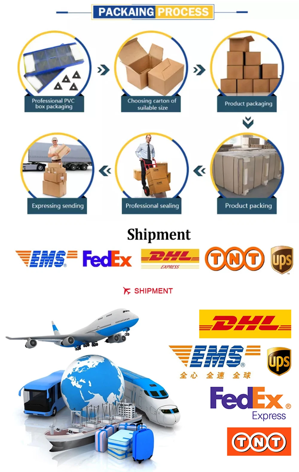 Шаг 1: одна пластиковая труба, одна штука, 10 штук в группе Шаг 2: Используйте воздушно-пузырчатую бумагу для нанесения пластиковой бумаги Шаг 3: Поместите товары, упакованные в воздушную пузырчатую бумагу, в картонную коробку Шаг 4: другая упаковка принимается в соответствии с вашими потребностями. Упаковка и доставка режущих вставок: • Стандартная коробка отлично защищает режущие вставки • Поддержка TNT, DHL, Fedex, EMS, UPS доставки, EUB, AliExpress и т. д.