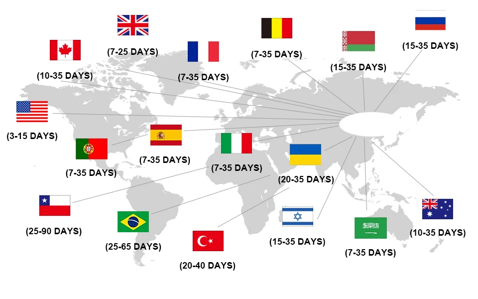 2. Расчетное время доставки (за исключением выходных и праздников): (1) около 8-20 рабочих дней в: Австралию, Канаду, Японию, Малайзию, Южную Корею, Сингапур, Великобританию, США; (2) около 9-30 рабочих дней в: Франция, Испания, Грецию, Норвегия, Швецию, Бельгию, Ирландия, Германия; (3) около 10-45 рабочих дней в: все другие страны; (4) Срок доставки оценен и не может быть 100% гарантирован;