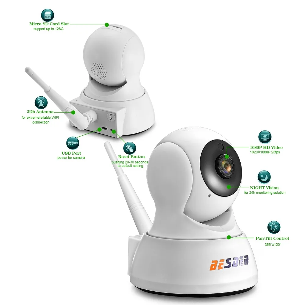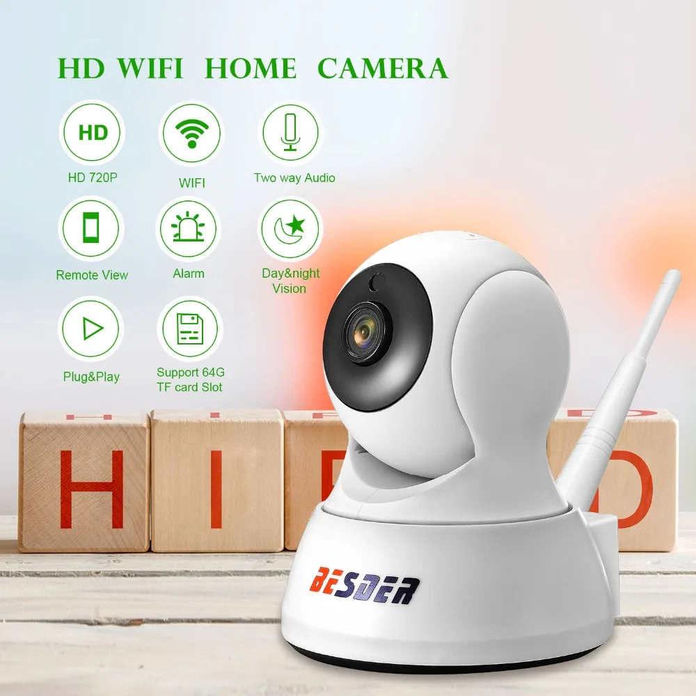 Беспроводная ip-камера 720P камера безопасности для дома/магазина/офиса/магазина Шифрование P2P/WPS, легче настроить WiFi и просмотр в Moblile Высокое разрешение: 1280x720,H.264 1,0 мегапикселя, 720P Тройной поток: 720P/ VAG/ QVGA Поддержка до 64 ГБ, TF карта памяти, 24-часовая запись. Встроенный IR-CUT, без цвета без Каст. 6 шт. ИК-светодиодов, ночное видение 10 м Панорама: 355 °, наклон: 90 ° Отведение движения, оповещение о массаже Поддержка WiFi приложения для управления несколькими камерами. Встроенный микрофон и Динамик, 2 способа аудио с 3D-sound технологии. Поддержка одновременного просмотра нескольких онлайн-пользователей. Многоязычный, не поддерживает IE, Firefox, Safari, Google browser Поддержка ONVIF 2,0