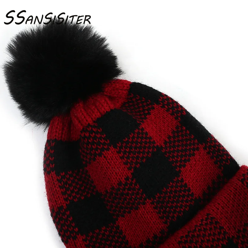 Рождественские детские шляпы для мам, одинаковые вязаные шапочки с помпоном из искусственного меха для всей семьи, зимние теплые хлопковые шапки в клетку из енота для мамы