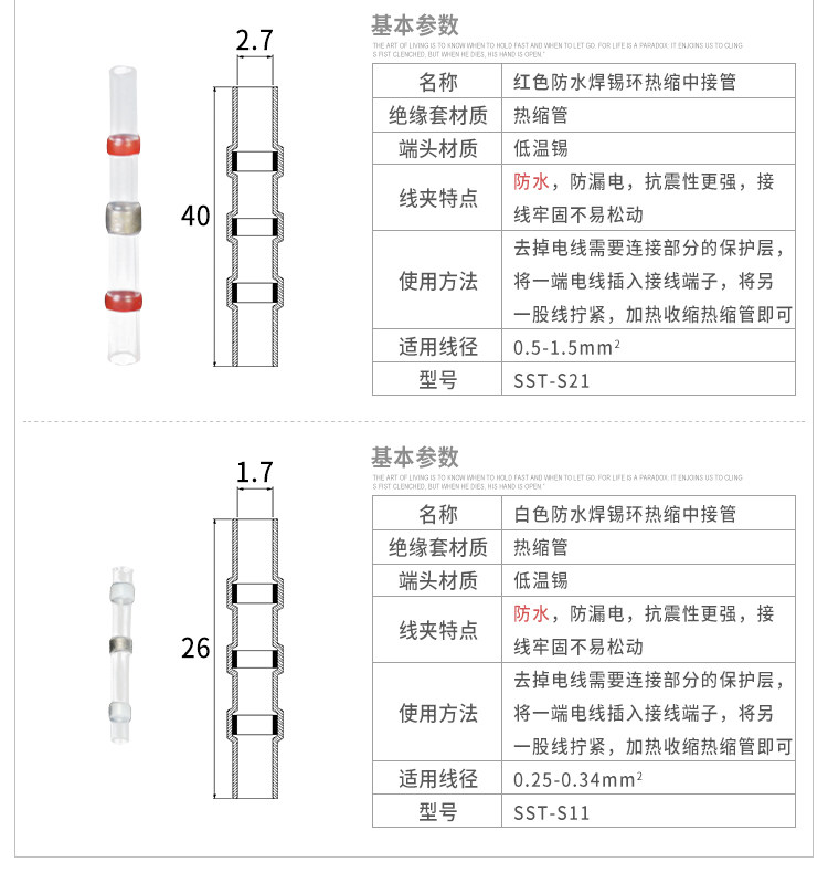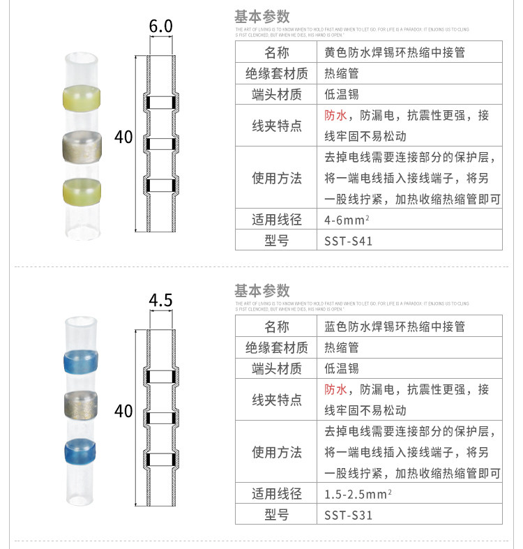 Применение Предназначен для проводных подключений. Характеристика Усадка 2: 1 Прозрачная внешняя трубка, способствующая осмотру С герметичными водонепроницаемыми, изоляционными свойствами Цвет горячего расплава показывает подходящий размер Диапазон рабочих температур Рабочая температура: -55 ℃ -125 ℃ Запуск температуры сжатия: 80 ℃ Температура начала плавления припоя: 138 ℃ Припой, полная Температура плавления: 160 ℃ Параметры производительности Рабочая температура -55 ℃ -125 ℃ Температура усадки > 160 ° C Прибор для тестирования Диэлектрической прочности 1kv Степень защиты IP 67 Применение Благодаря комбинации сплава с низкой температурой плавления и термоусадочной трубки, могут использоваться вместо электрической паяльной сварки, конструкция старого закона, может защитить от окисления воздуха и других коррозионных газов, но также, чтобы предотвратить контакт друг с другом, контакты широко используются в железных дорогах, лодках, аэрокосмической, электроэнергетике, Электроника и другие области. Предназначен для проводных подключений, термоусадочной защиты от двойного припоя, водонепроницаемый дизайн готовой продукции. Характеристика Усадка 2: 1 Горячий расплав клея с водонепроницаемой функцией Разметка цвета горячего расплава для размера Дизайн паяльного кольца, легкая конструкция Диапазон рабочих температур Рабочая температура: -55 ℃ ~ 125 ℃ Температура полной сушки: 130 ℃ Температура начала плавления припоя: 125 ℃ Температура плавления припоя: 150 ℃ Обратите внимание:Пожалуйста, выберите Почта Китая Registered Air Mail (заказное, Авиапочта, в том случае, если вы хотите получить полную информацию о отслеживании.Наша бесплатная доставка Почта Китая Ordinary Small Packet Plus)Новый номер отслеживания для Почта Китая Ordinary Small Packet Plus) может быть отслежена только до того, как он прибудет в аэропорт вашей страны. Почта Китая Ordinary Small Packet Plus) может быть отслеживания здесь: www.17track.net/en Рекомендуем: Http:/store/2387091 Нет мини-заказ, только в том случае, если меньше, чем $5, мы отправим товар службой доставки Почта Китая Small Packet заказным отправлением авиапочтой Китая.Если возможно, пожалуйста, используйте корзину для покупок в моем магазине и купите больше, чем $10, чтобы мы могли отправить товар с хорошей доставкой.