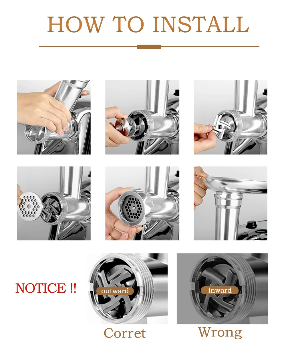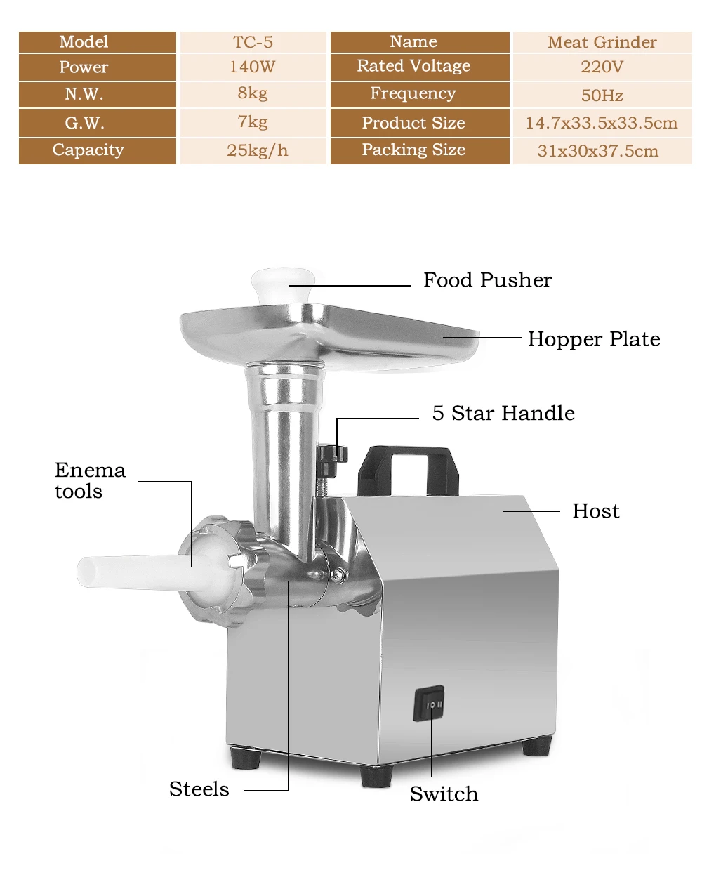Описание: Название: мясорубка для домашнего использования Модель: TC-5 Материал: Нержавеющая сталь Напряжение: 110-240V/50-60 Гц Штекер: US/EU/UK розетки Ёмкость: 25 кг/ч Вес: 8 кг Размер упаковки: 31*30*38 см Особенности: 1. Полностью закрытого типа алюминиевый сплав имеет компактную конструкции с зубчатой передачи. Это легкая работа и работает стабильно. 2. Наша цель-здоровья и гигиены. Корпус изготовлен из высокое качество нержавеющая сталь. 3. Пищевой контактные части изготовлены из пищевой алюминиевый сплав с силовое, это делает поверхность гладкая, без края sharp и разрезом для грязь легко стирается. 4. Головка шлифовального станка легко разборки и очистки. Дизайн элегантный и красивый. 5. Двигатель оснащен двумя устройство защиты от перегрева, он работает безопасный и надежный. 6. Мясорубка работать эффективно и продуктивно.